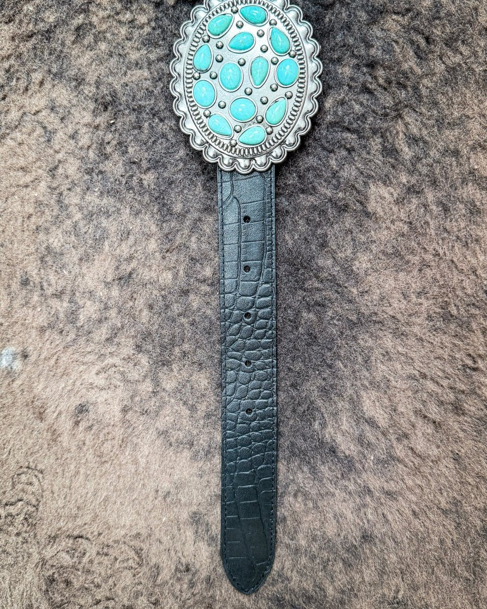 Make every outfit feel pulled together with the Ravenstone Turquoise Concho Belt in Black. Designed for cowgirl chic styling with a polished finish, this statement belt features scalloped conchos in an antique silver tone, each detailed with vibrant faux turquoise stones for that classic Southwestern look. The black strap has a subtle crocodile embossed texture that adds depth without feeling loud, so it pairs just as easily with everyday denim as it does with a dress or skirt.