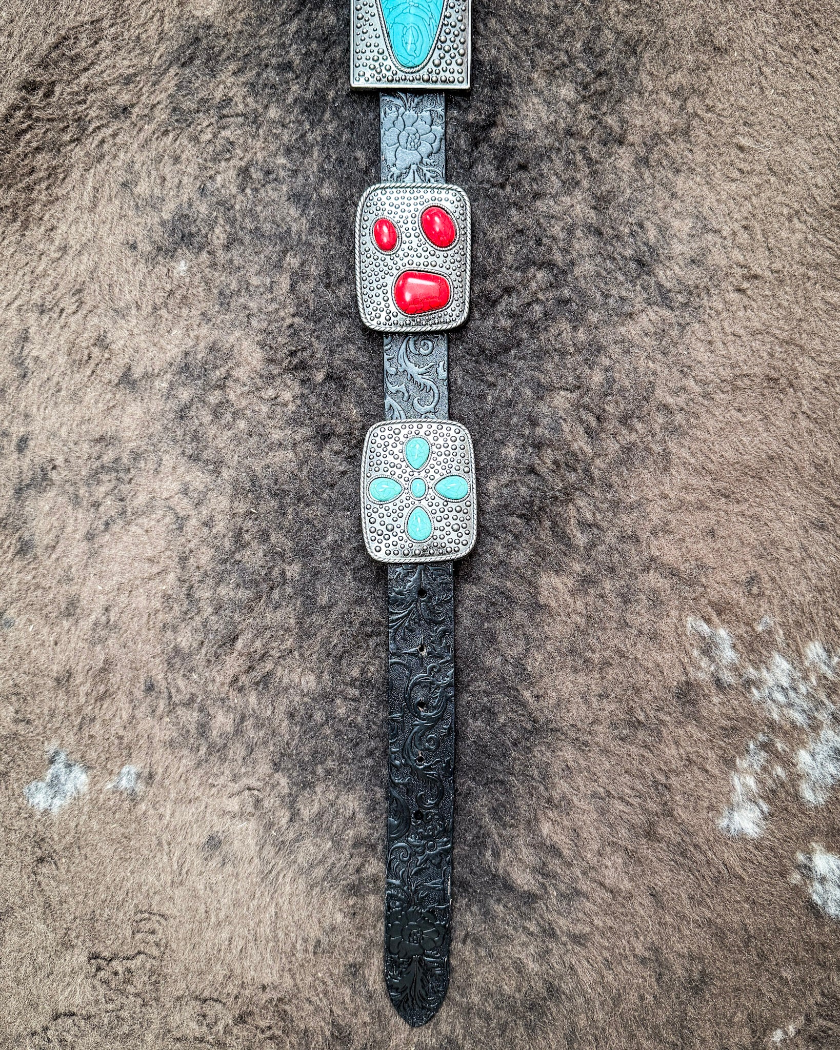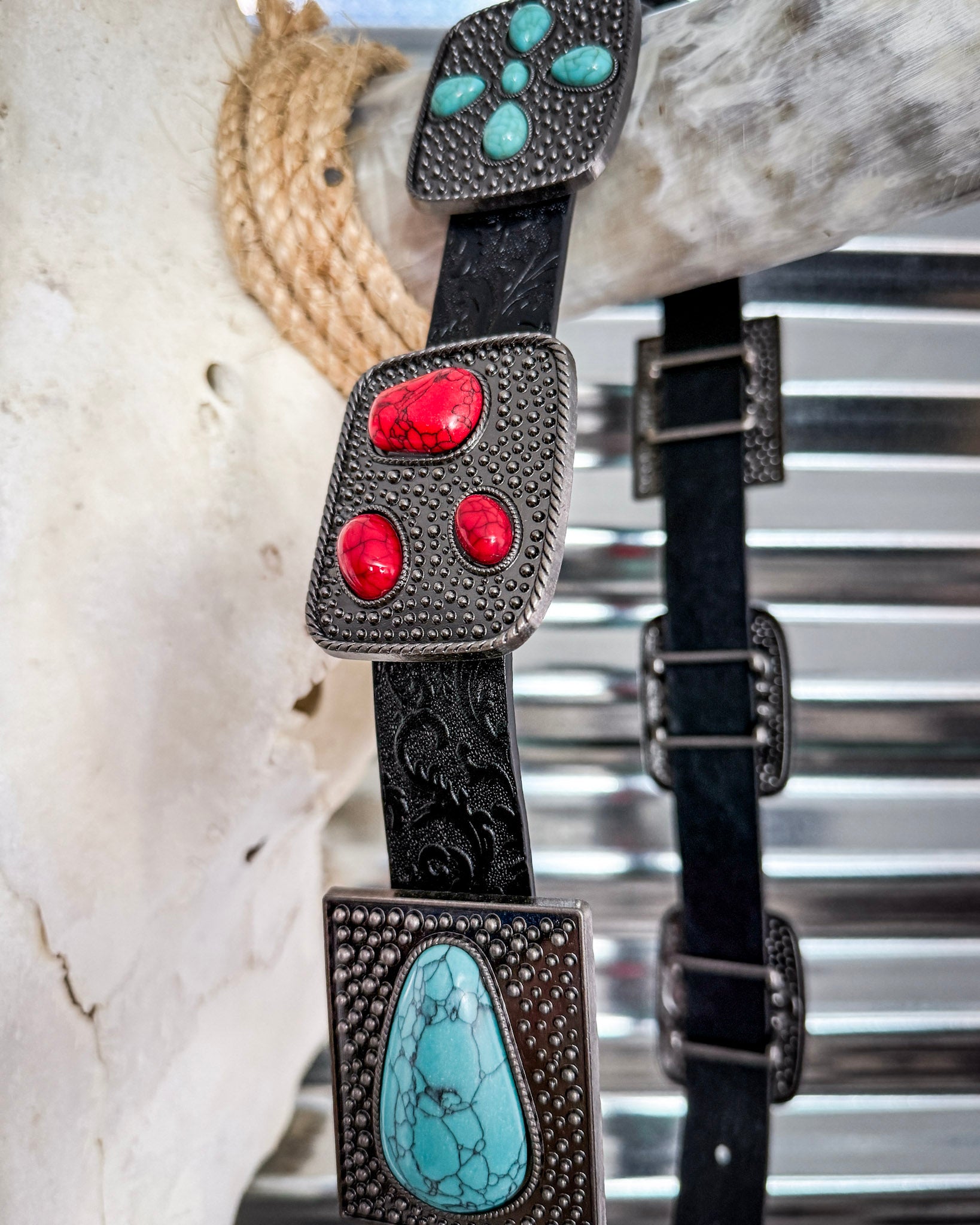 - Alternating turquoise and red stone conchos