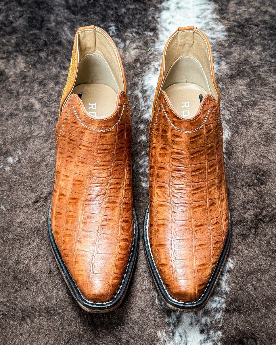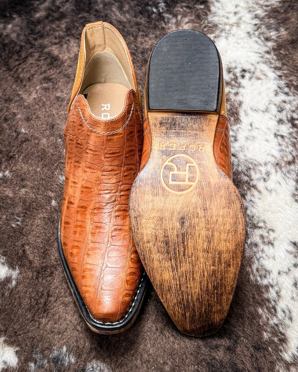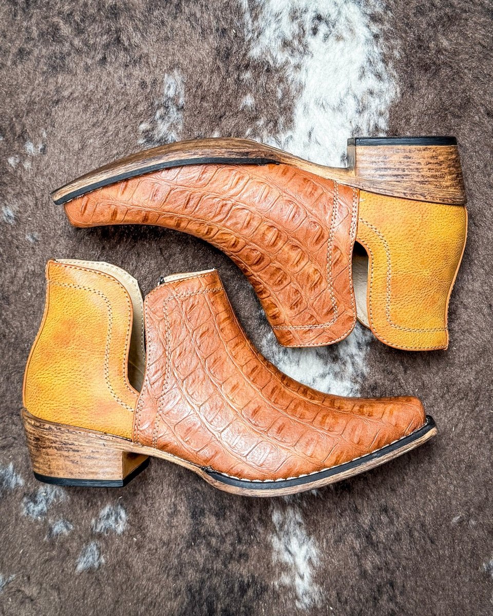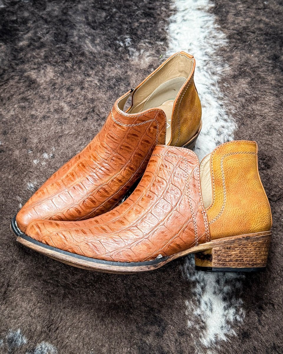 The Ava Caiman Booties in Tan by Roper bring a bold, exotic feel to your everyday western look. With a rich faux caiman texture across the vamp and a burnished tan faux leather heel, these ankle booties offer just the right mix of rugged and refined. The cushioned insole and flexible TPR outsole make 'em easy to wear all day, while the 1.5" stacked heel adds that subtle boost. Whether you're dressin' up or keepin’ it casual, Ava Caiman is ready to step up your boot game.