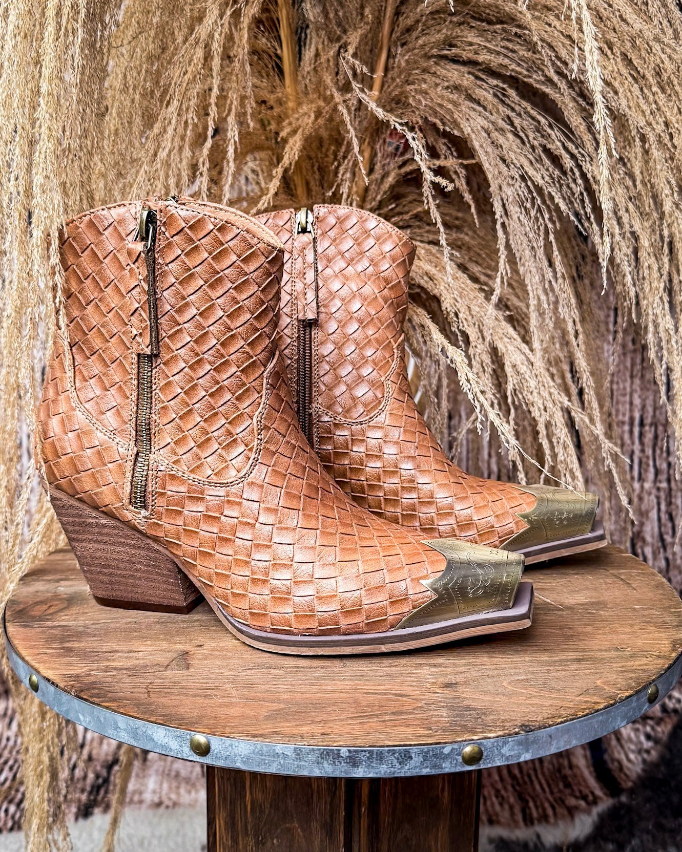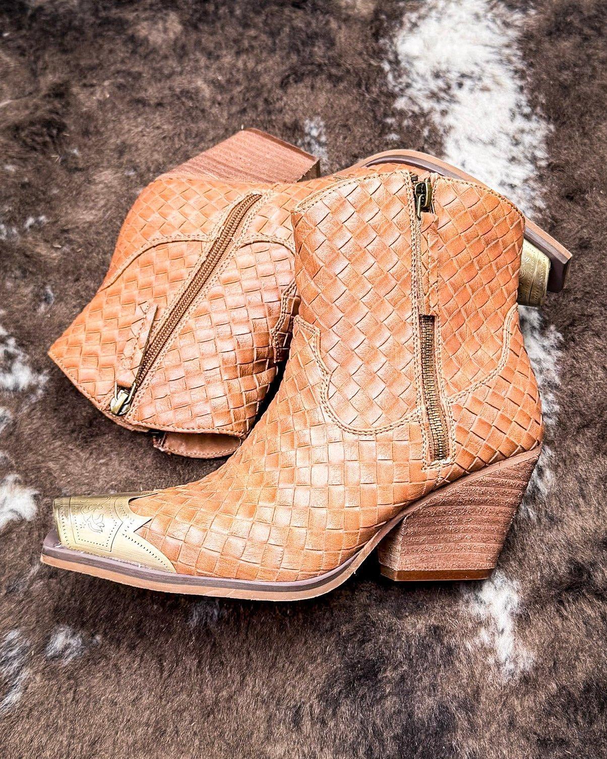 • Meet your new go-to boot for everyday western-boho edge: the Jim Ankle Bootie by Very G. This one brings serious texture with a basketweave faux leather upper, plus bold details like a burnished metal toe cap, 2 side zippers, and stacked block heel that adds just the right lift.