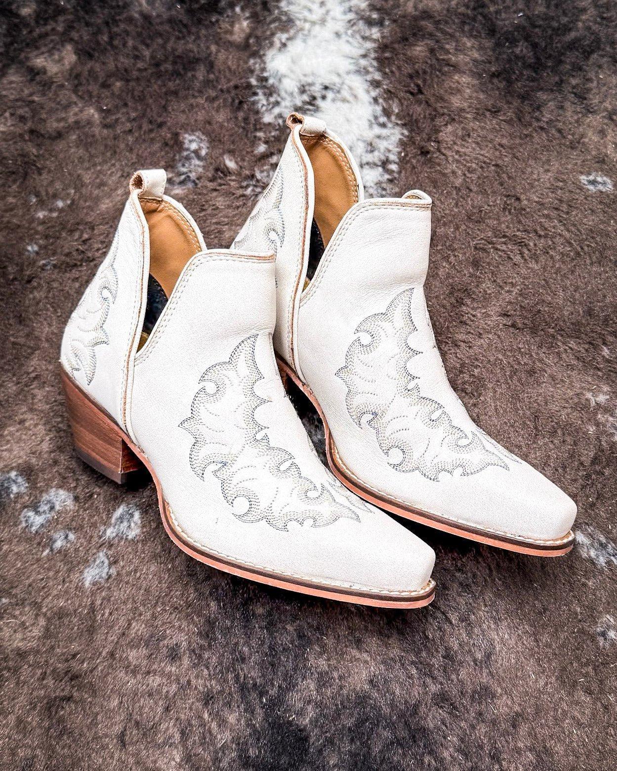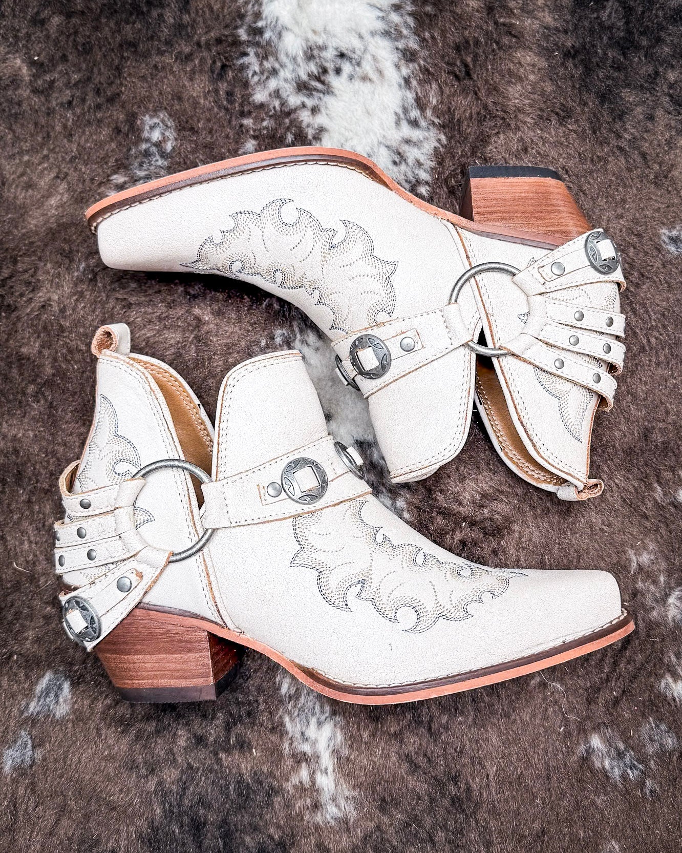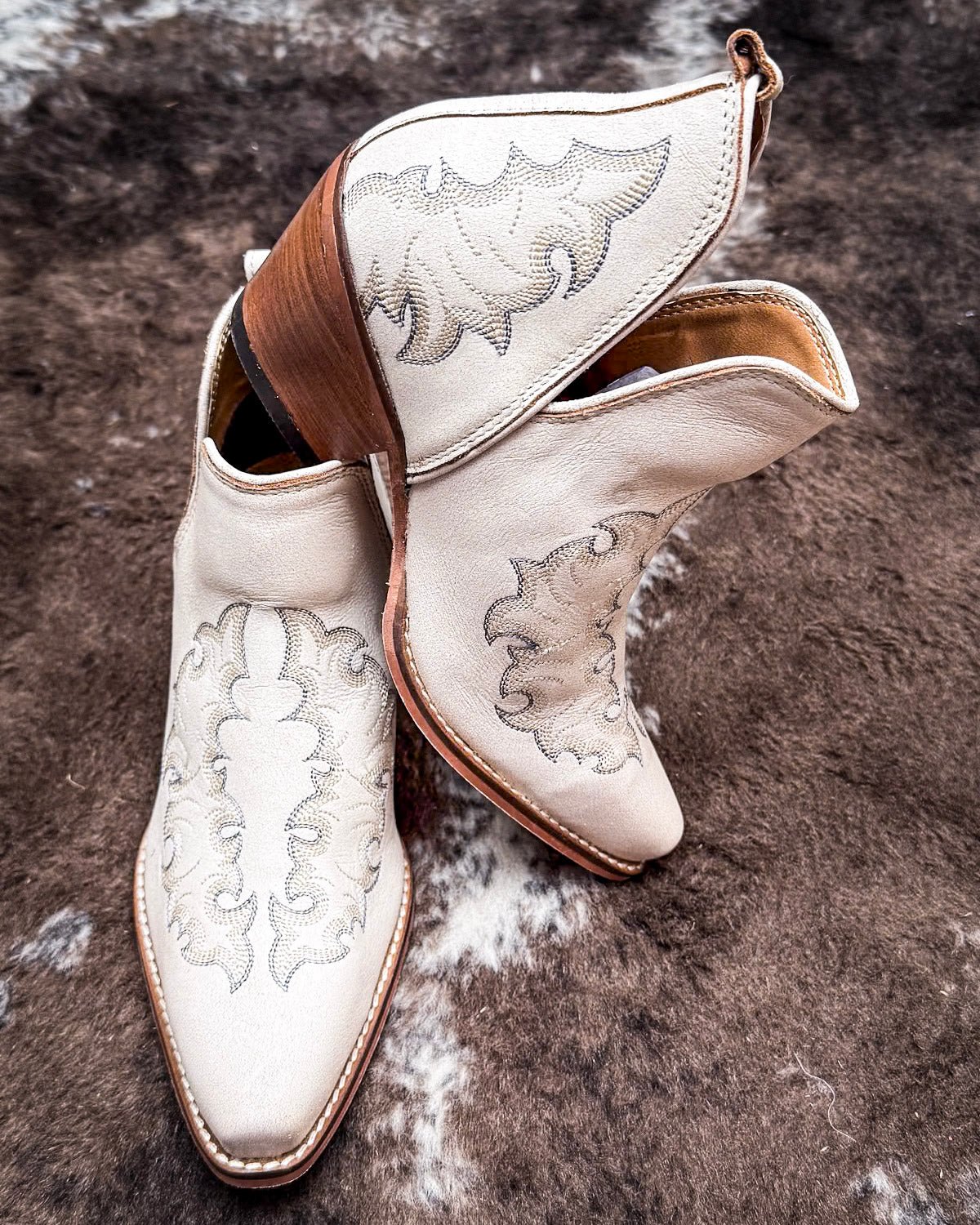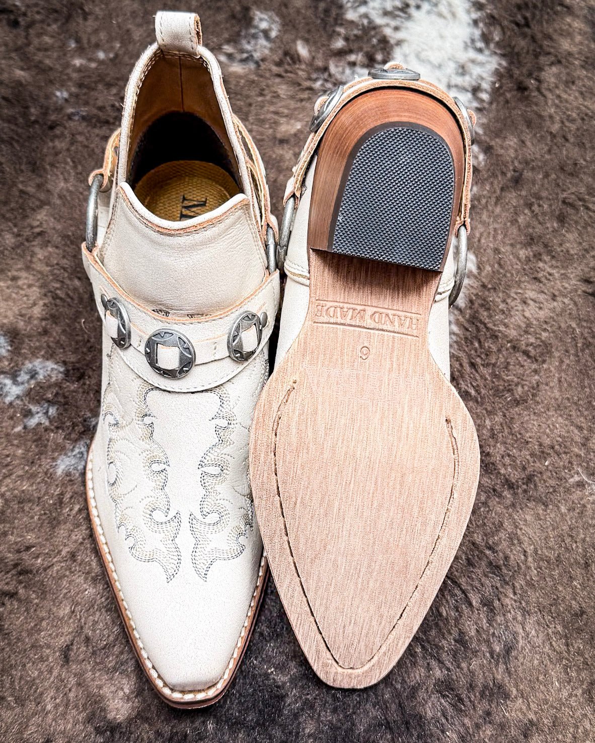 Sleek and striking, the Myra Western Ember Booties in White bring fresh energy to a timeless western silhouette. Crafted from genuine leather, these booties pair classic embroidery with bold hardware details for a look that’s equal parts modern and traditional.