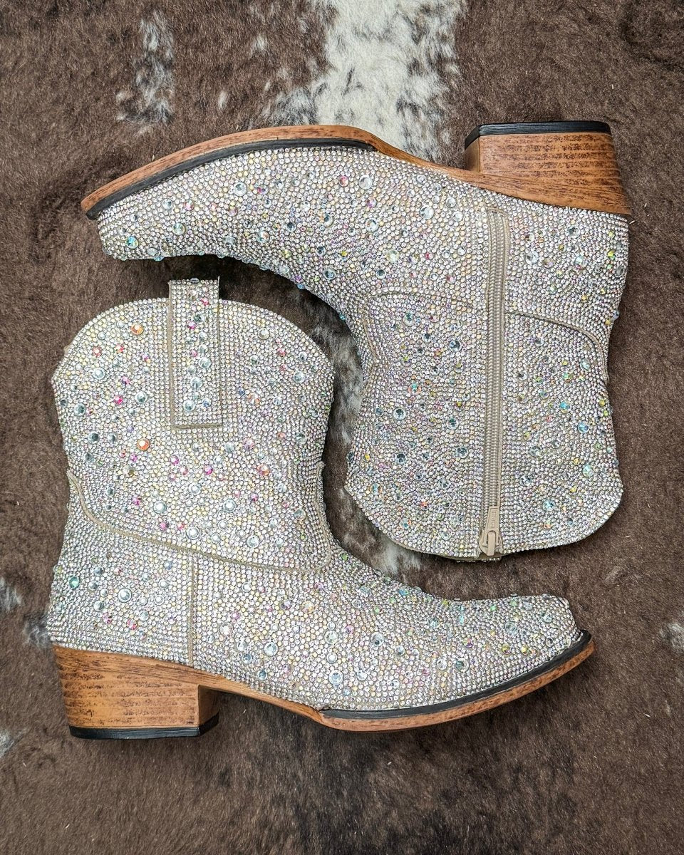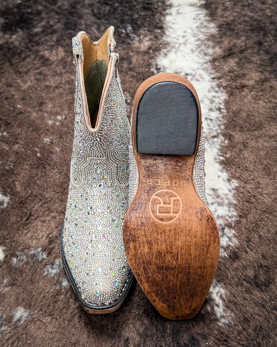 The Shay Jewells Booties in Silver by Roper are pure western glam—from top to toe. Covered in shimmering silver crystals and sequins, these boots were made for the spotlight. The snip toe, single welt, and 7" shaft keep the classic western silhouette, while the inside zipper makes slipping ‘em on a breeze. A cushioned insole and flexible TPR outsole mean you’ll be dancing 'til last call without a second thought. Whether it's a night out, a special event, or just your everyday shine—Shay’s ready to steal the show.