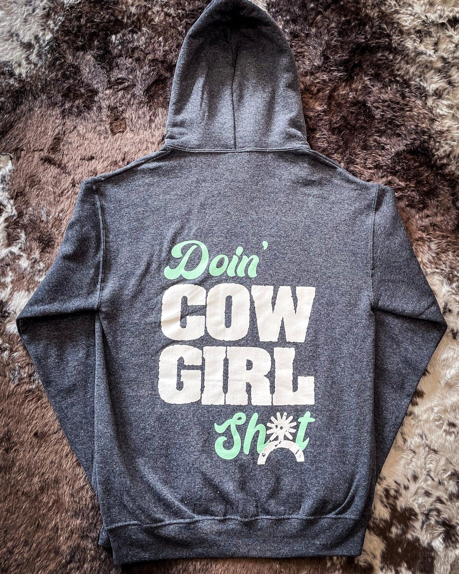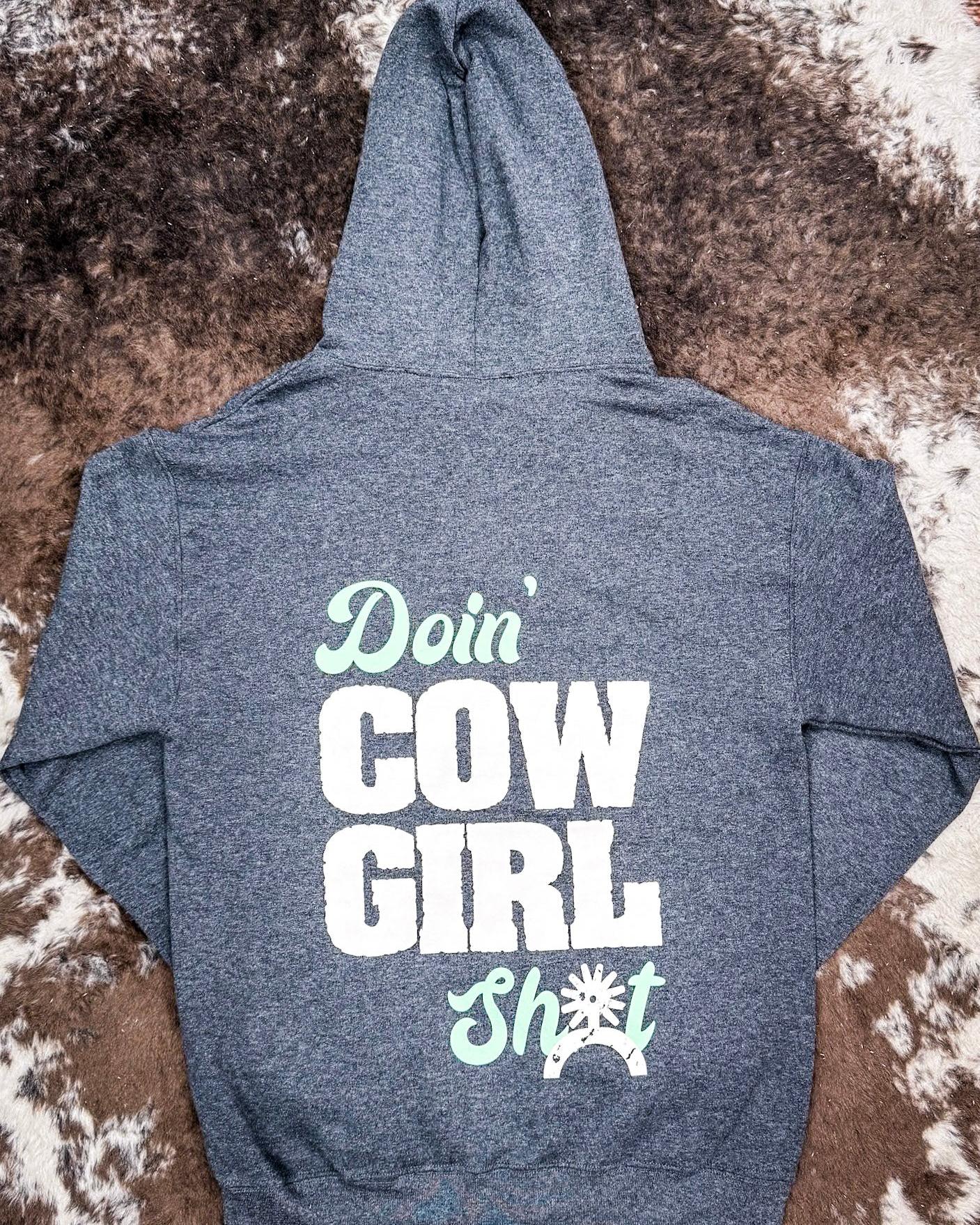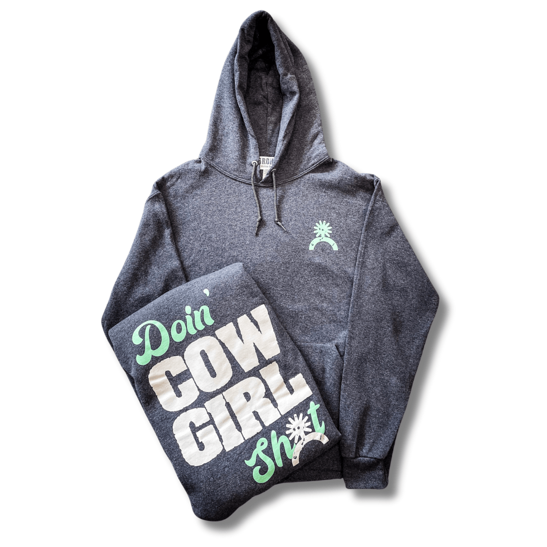 Now let’s talk about what makes this piece more than just another hoodie. Stamped loud and proud on the back, the phrase “Doin’ Cowgirl Sh*t” isn’t just a saying—it’s a statement. It’s for the ones who throw hay, load trailers, chase goals, and handle their business without waiting on approval. The oversized lettering gives it a bold, unapologetic edge, while the soft mint green details and Spur Up graphic add a hit of personality without going soft.