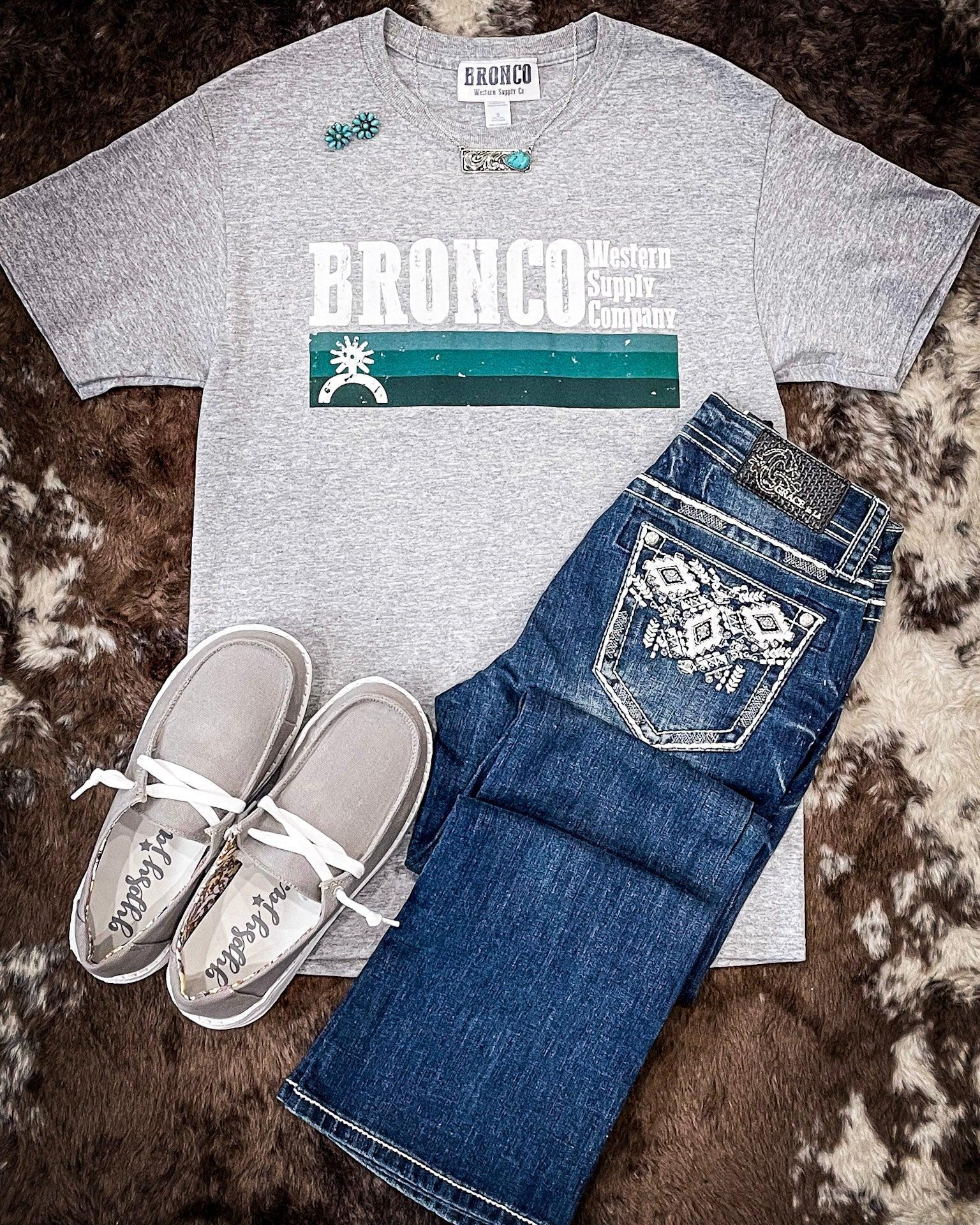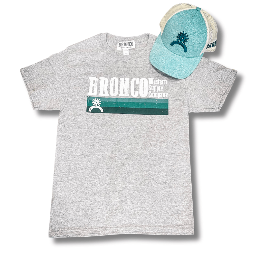 The Current Tee by Bronco Western Supply Co. is a stylish and versatile unisex t-shirt in a heathered grey color. Featuring bold teal and dark turquoise accents, this tee adds a pop of color while maintaining a classic, laid-back look. Perfect for everyday wear, its soft, comfortable fabric offers a relaxed fit that suits any casual occasion. Whether you're out on the ranch or hanging with friends, the Current Tee blends western charm with modern style.