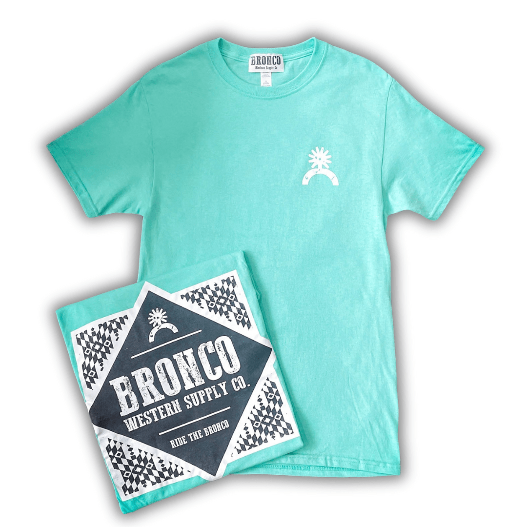 At first glance, it’s simple and clean with our Spur Up logo stamped right over the heart. But turn around, and it makes a statement. The bold Bronco Western Supply Co. back graphic is wrapped in a bandana-inspired frame that brings in a little southwest soul with modern-day punch. It’s all about honoring the grit and heart of western roots, in a way that feels totally now.
