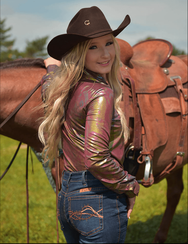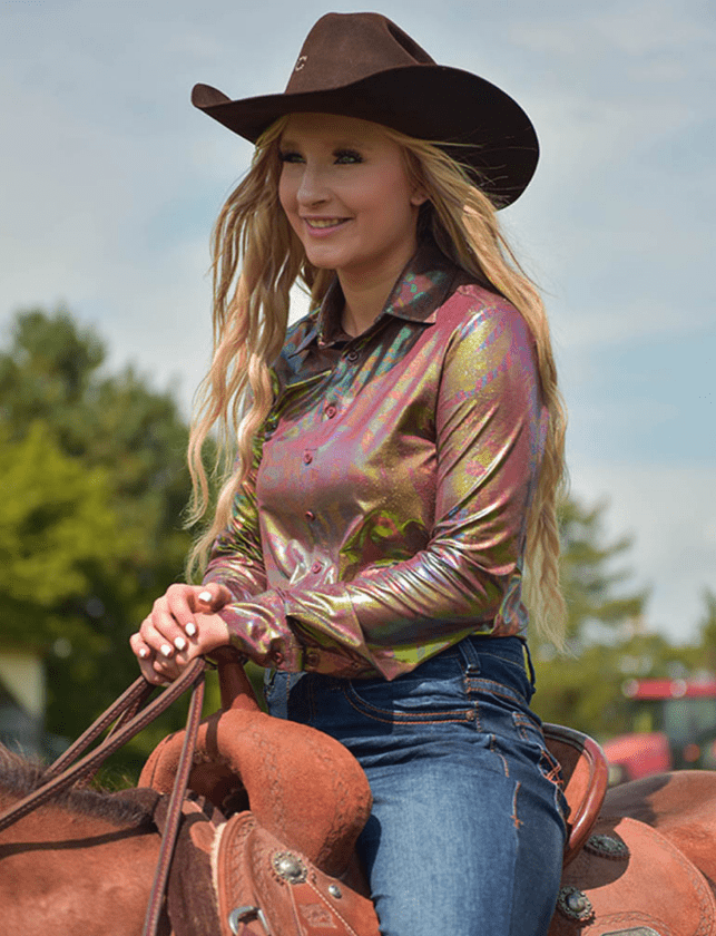 The stunning garnet color with an iridescent glow makes this shirt a true standout. As the light shifts, the fabric comes alive with subtle undertones of gold, green, and violet, giving the shirt a dynamic, jewel-toned shimmer that’s as unique as you are. Whether you’re riding, competing, or heading out for a night on the town, the Garnet Glow guarantees you’ll be noticed—in all the right ways.