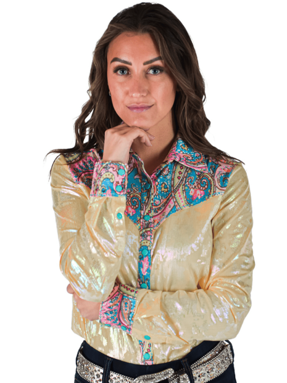 Cowgirl Tuff Golden Hour – Metallic Button Up with Paisley Accents