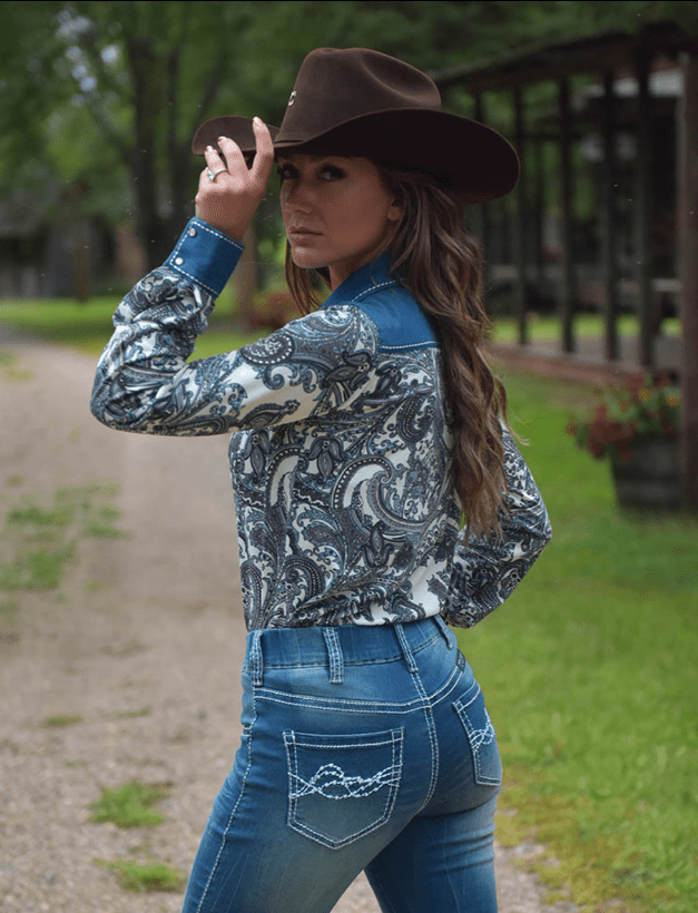 From the arena to everyday life, this pullover holds its own. It’s got the charm of a classic Western button-up, but with thoughtful features that truly work for how you move. Let’s start with the fit: it’s tailored just right with a sleek silhouette, but there’s real comfort in the stretch fabric that lets you move freely without restriction. No stiff shoulders here. The custom-designed paisley body paired with a deep denim yoke adds structure and style in all the right places, while still keeping that vintage Western soul.