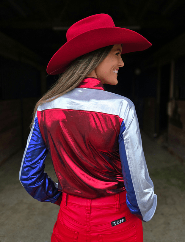 From the rodeo arena to the grandstand spotlight, this shirt shines bright—literally. The silver foil shoulders throw light with every move, while the deep blue front and bold red back bring serious Americana attitude. It’s eye-catching, high-energy, and unapologetically extra. Whether you're competing or just want to make an entrance, the Red White and Rodeo is ready for it all.