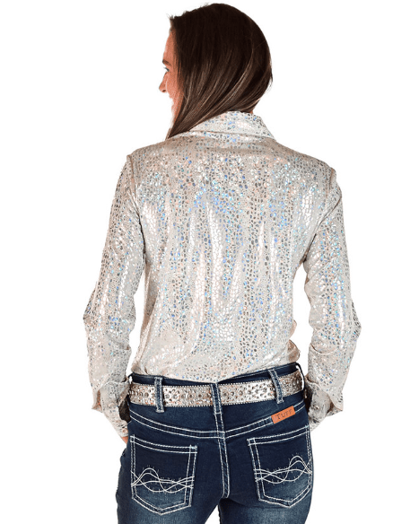 When performance meets sparkle, you get the White Party Chrome Pullover—a lightweight, high-stretch showstopper designed to keep up with every move you make. With a dazzling iridescent chrome print that shifts in the light, this top brings the drama in all the right ways without sacrificing comfort or function. Whether you're under arena lights or out for a night on the town, this one’s gonna turn heads.