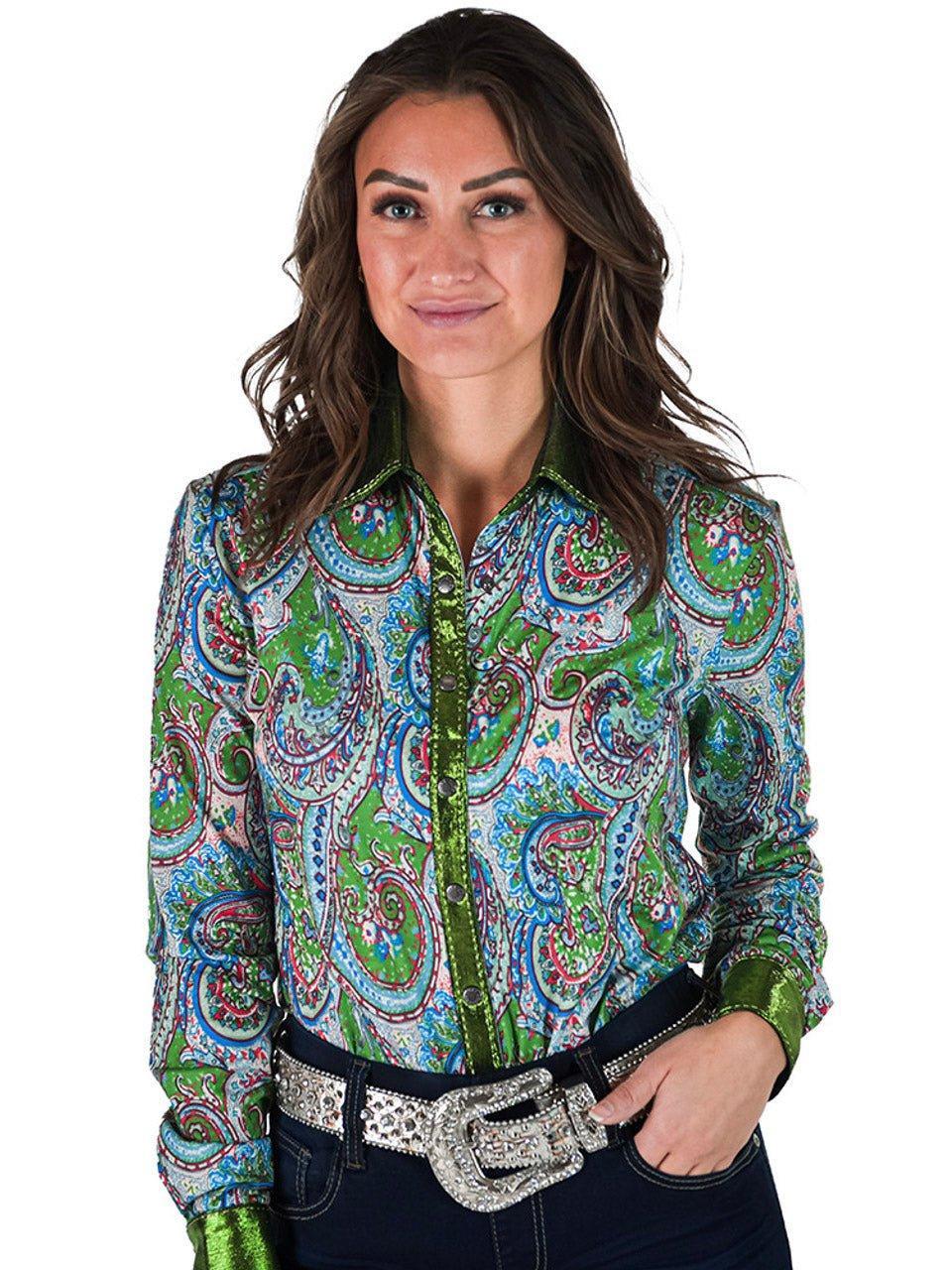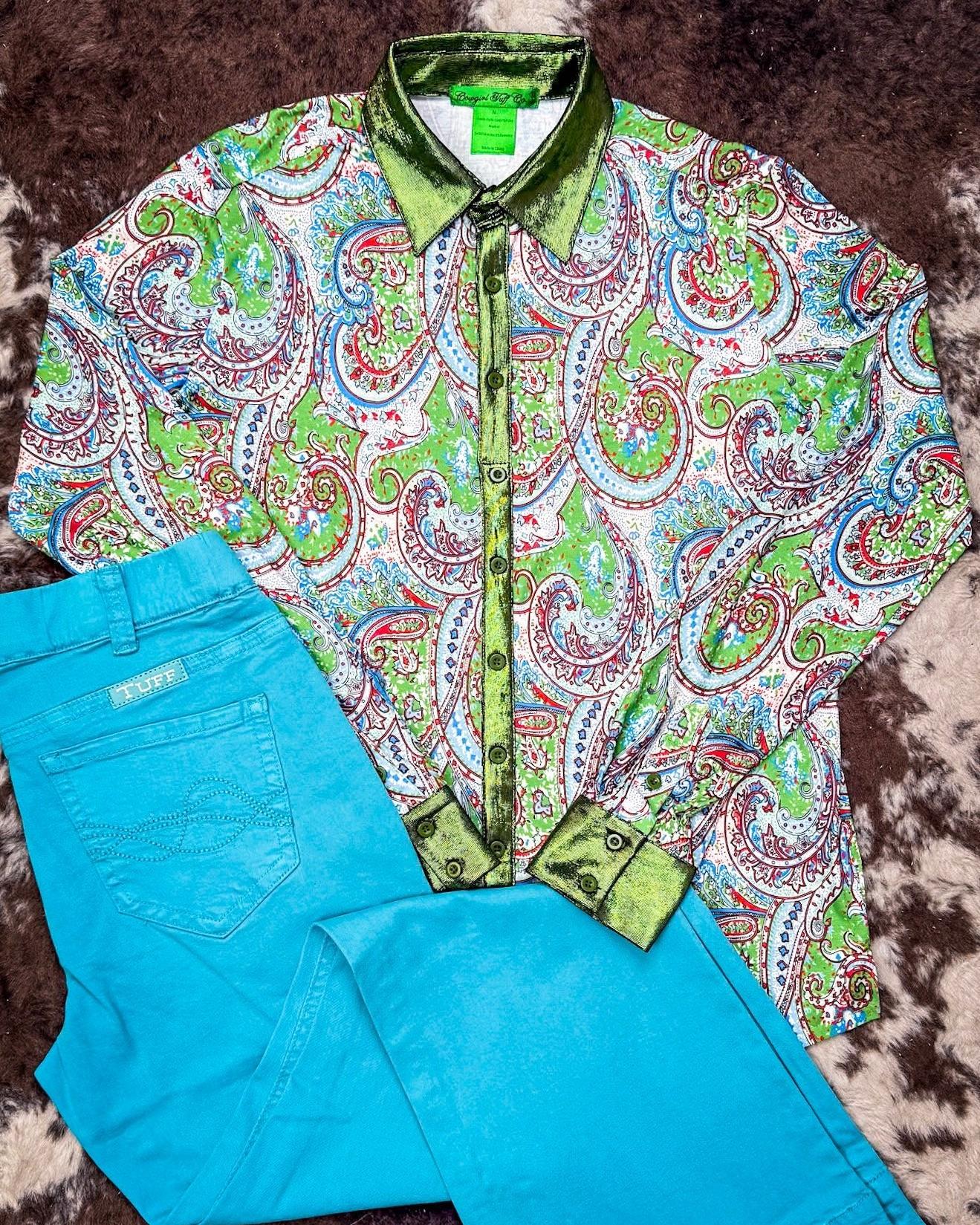 This pullover button-up features a kaleidoscope of classic paisley in vibrant pinks, blues, and greens, brought to life with striking metallic green accents that catch the light and turn heads. From the satin-finish collar to the glossy cuffs and button placket, this top knows how to make an entrance — and leave a lasting impression.
