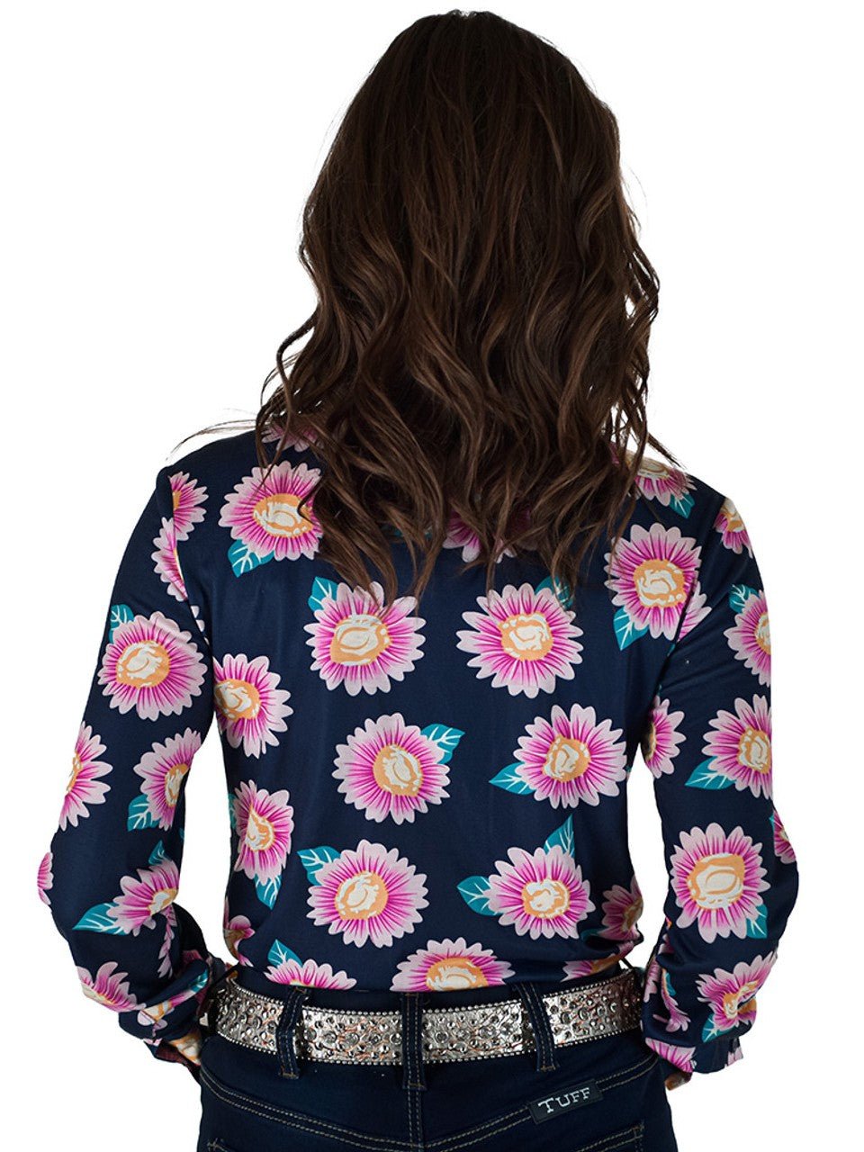 The print is a standout: large sun-kissed floral blooms in shades of pink, yellow, and white are sprinkled across the fabric, adding a fun, carefree edge to your western wardrobe. The color contrast is striking, but still balanced—thanks to the grounding navy base, it’s bold without being over-the-top.