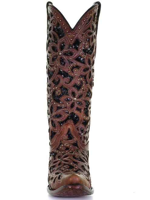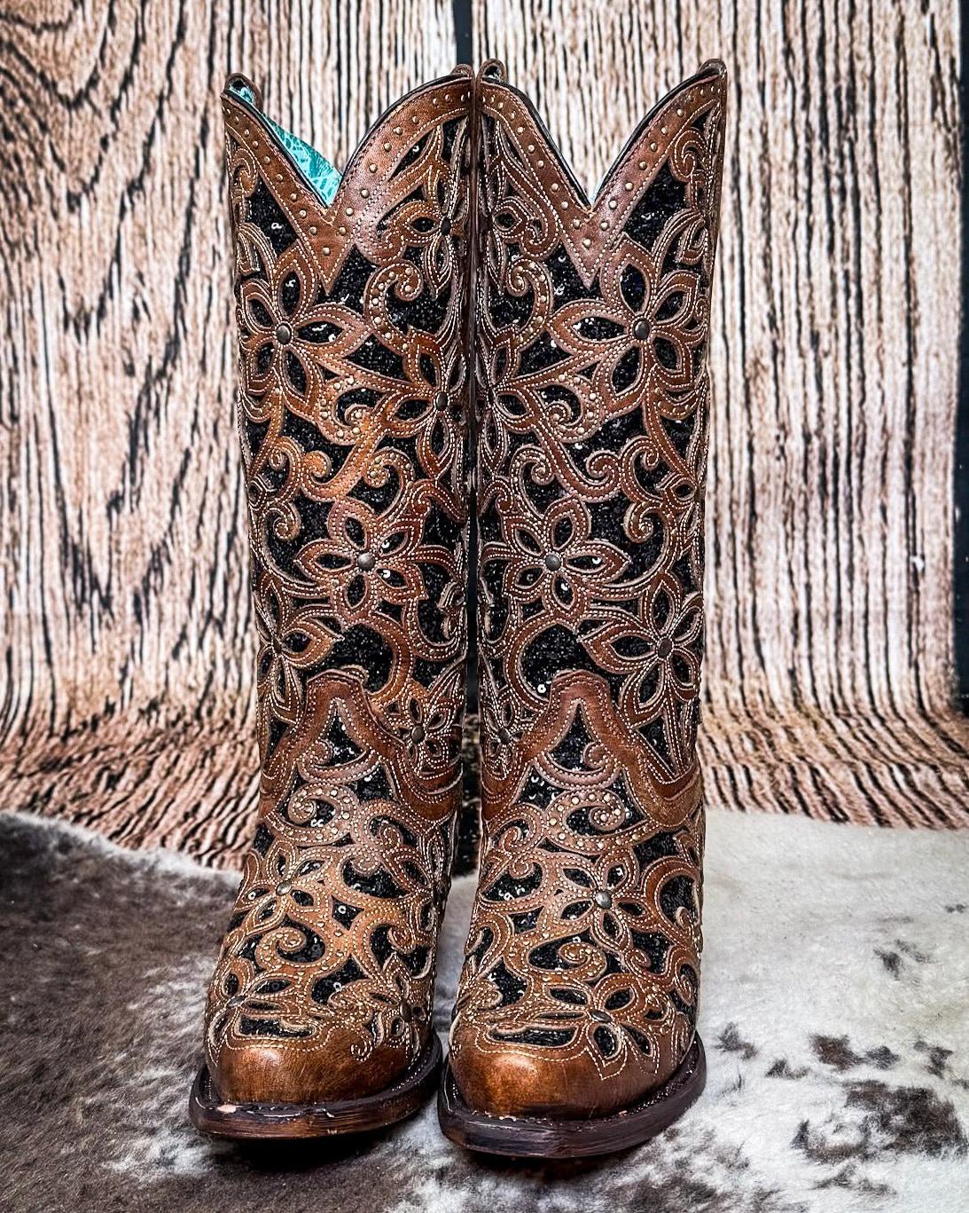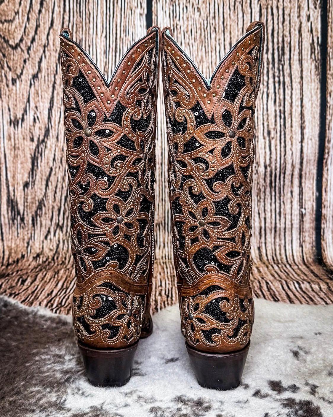 Built on a foundation of rich cowhide leather, the Bronzed Bloom brings warmth and depth from the moment you slip it on. The tone is a beautifully bronzed brown, not too dark and not too light, making it easy to pair with just about everything in your closet. But what really makes this boot stand out is the floral overlay design—cut by hand, layered with care, and stitched with precision. Black sequin inlays peek through the flowers, adding a subtle shimmer that catches the light just right. It’s bold without being loud. Feminine without feeling frilly. And entirely unforgettable.