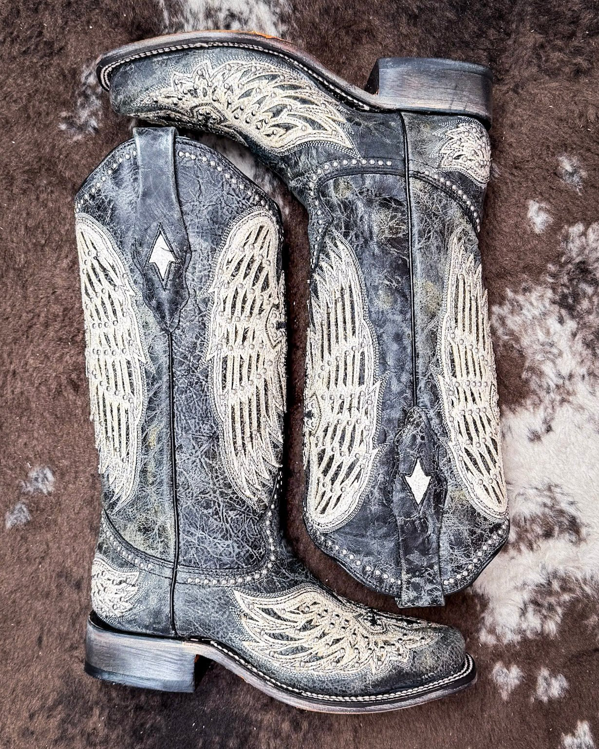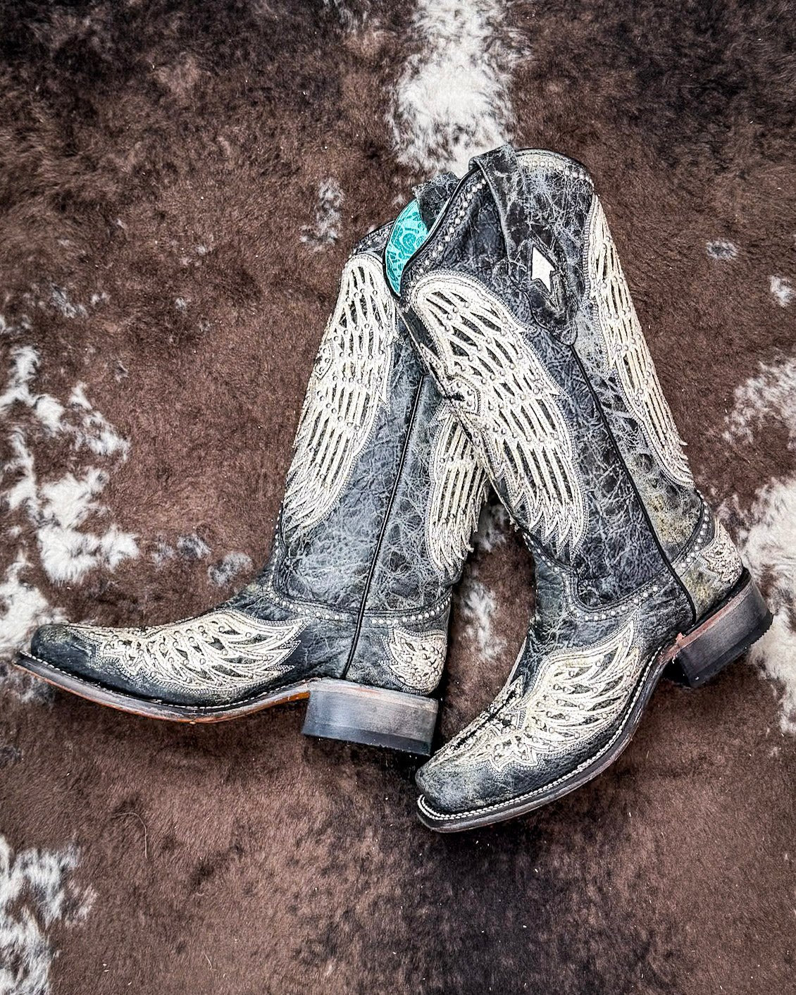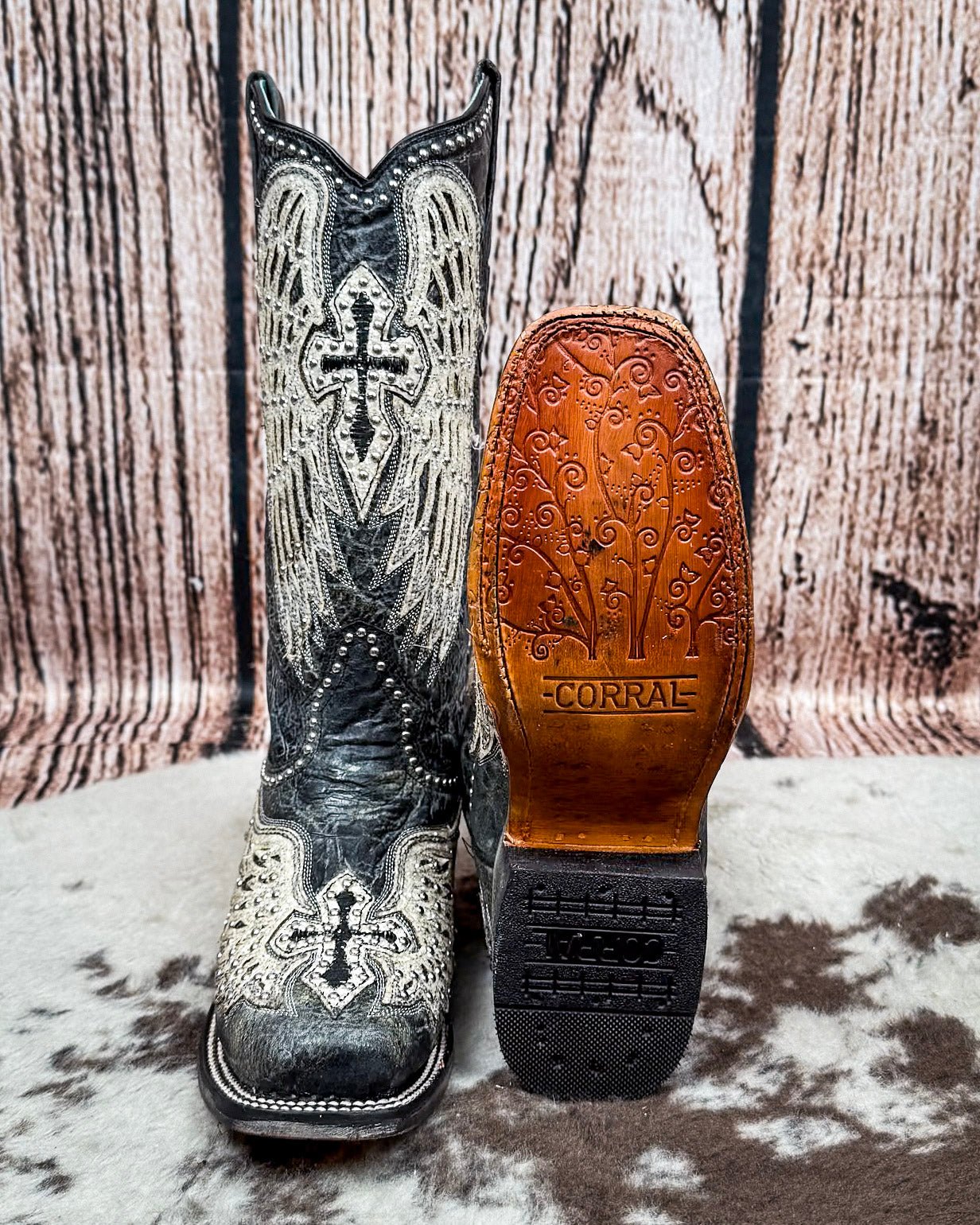 Corral + Circle G boots ship directly from the manufacturer, so please allow 7–14 business days for your order to hit the road. Good things take time—and trust us, these boots are worth it. These boots ship from the maker and must go to a physical address. No PO Boxes, please!Fierce meets feminine in the Holy Wild Boots by Corral—a bold return of an iconic favorite, now refreshed with extra sparkle. These boots feature Corral’s signature winged cross design, embroidered in soft ivory and elevated with crystal and stud accents that catch the light just right. Set against a distressed black leather shaft, the look is equal parts classic and statement-making.