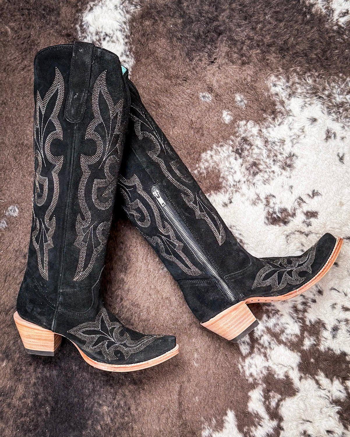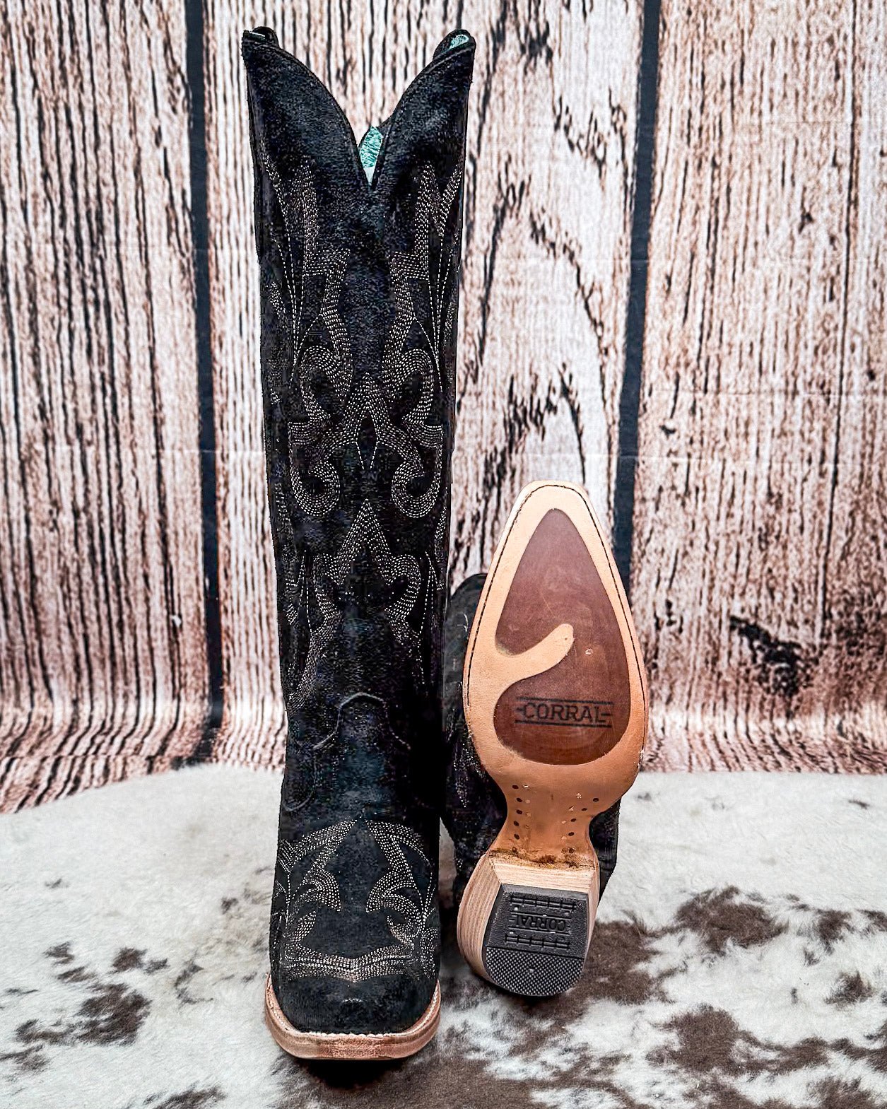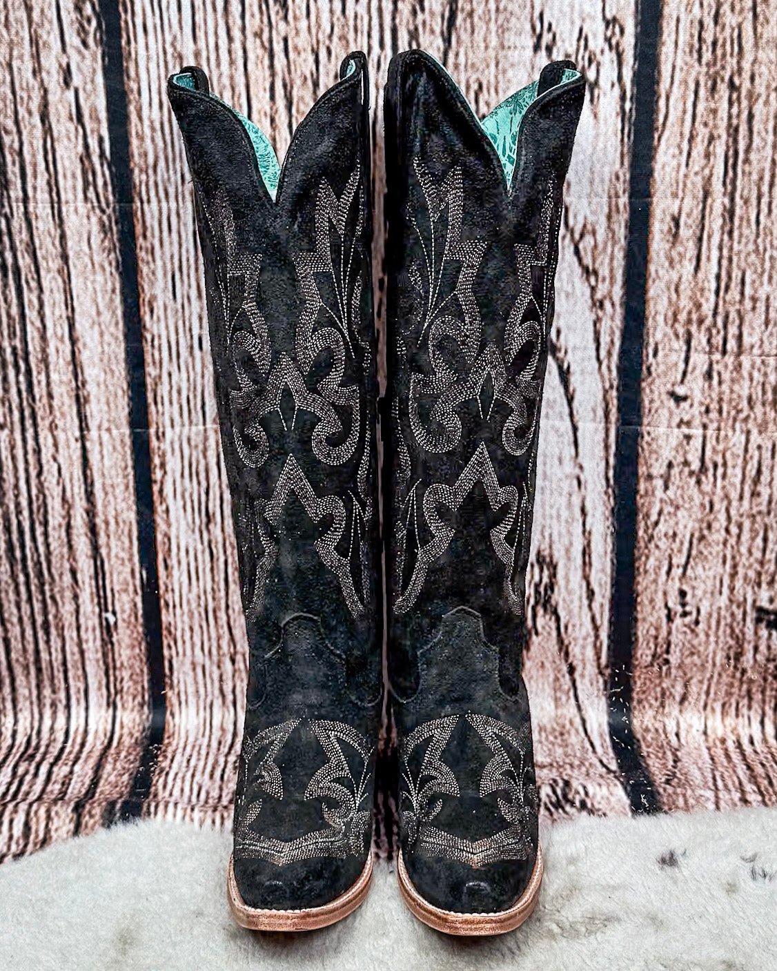 Corral + Circle G boots ship directly from the manufacturer, so please allow 7–14 business days for your order to hit the road. Good things take time—and trust us, these boots are worth it. These boots ship from the maker and must go to a physical address. No PO Boxes, please!Chic, understated, and effortlessly cool—the Midnight Muse Boots by Corral are your new go-to for timeless western style. Made from luxe black suede, these tall boots feature subtle embroidery that catches the light without stealing the show. The 15" shaft gives you that sleek, leg-lengthening silhouette, while the snip toe adds just the right touch of western charm.