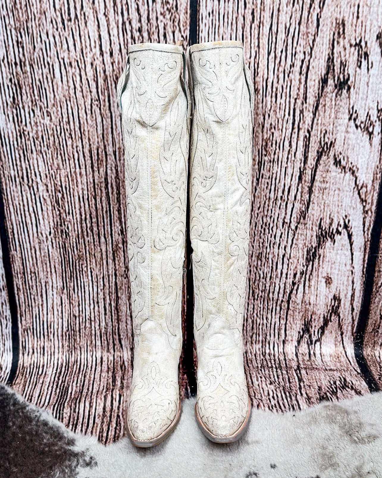 Graceful with a little glam—the Prairie Pearl Boots by Corral are tall, striking, and designed to make an entrance. With a dreamy 22" shaft and a soft beige finish, these boots bring elevated western style to life. The intricate detailing is laced with glittered overlays that catch the light just right, adding sparkle without stealing the show.