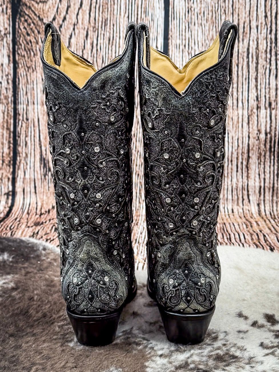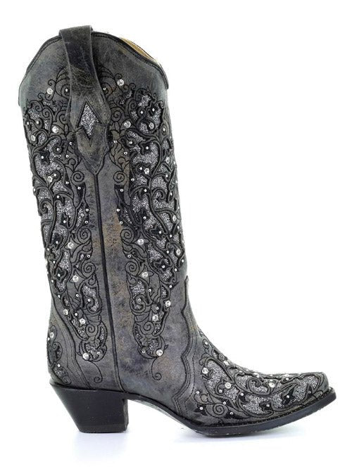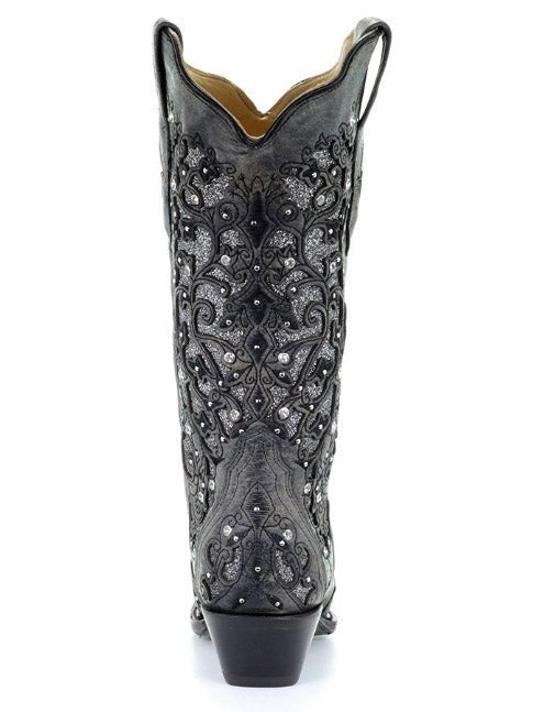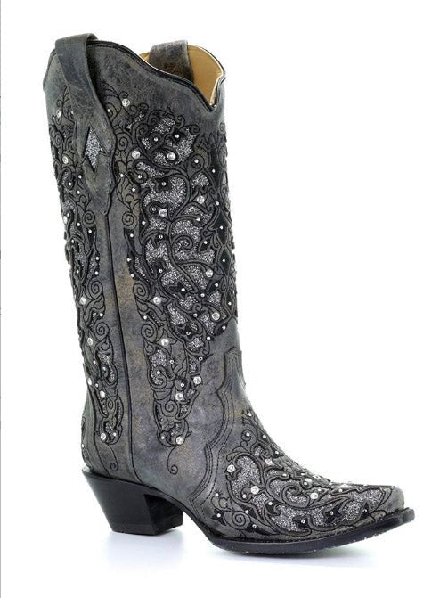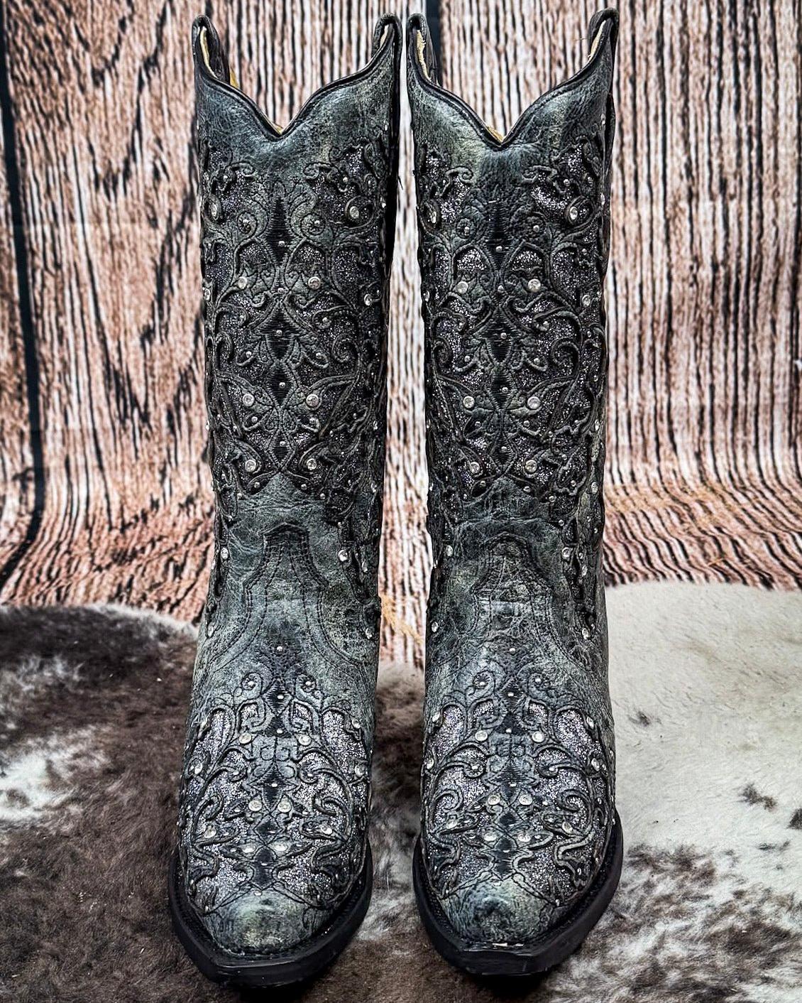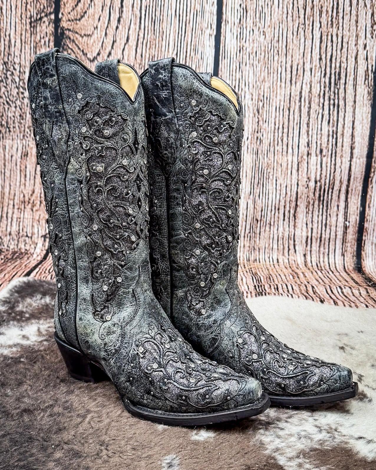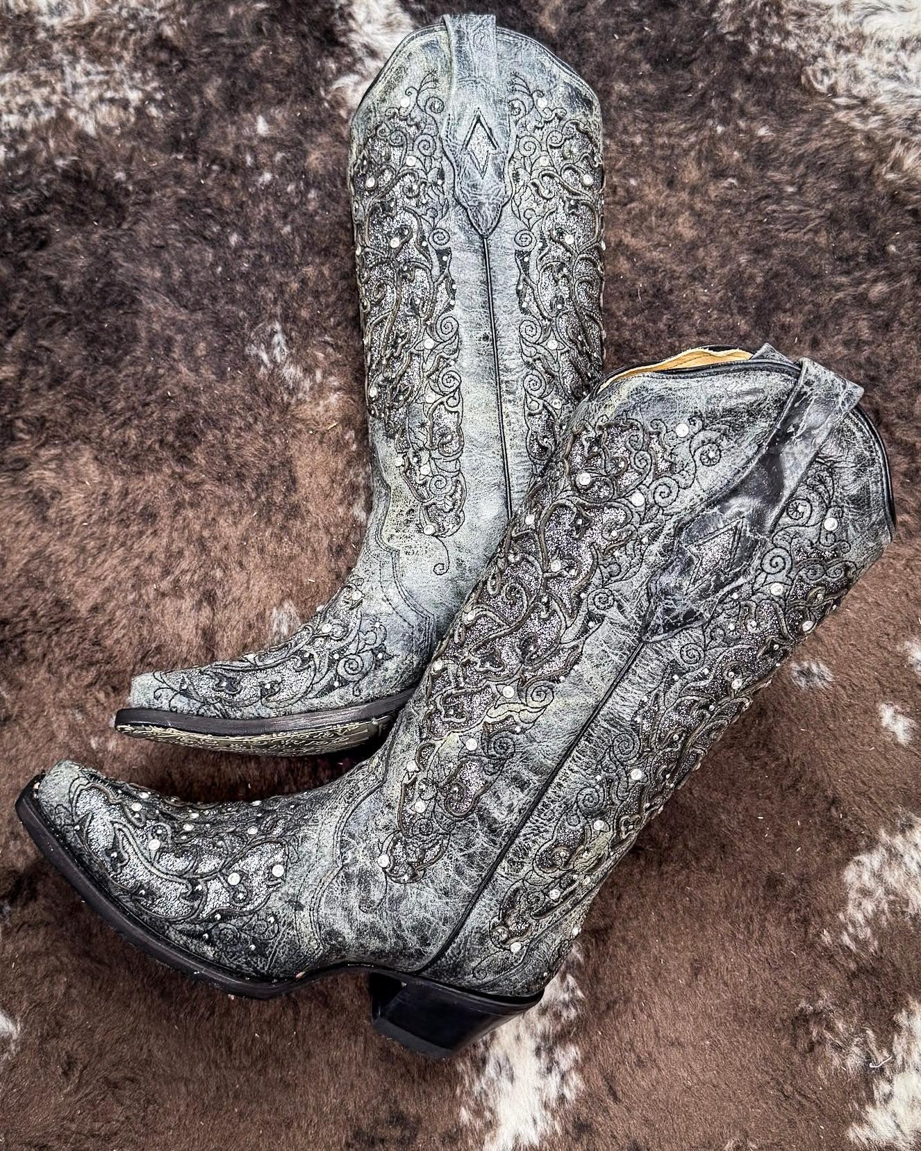 Corral + Circle G boots ship directly from the manufacturer, so please allow 7–14 business days for your order to hit the road. Good things take time—and trust us, these boots are worth it. These boots ship from the maker and must go to a physical address. No PO Boxes, please!The Silver Squall Corral Boot is where vintage glam meets stormy elegance. Drenched in a smoky gray cowhide and adorned with intricate embroidery and glittering accents, this boot brings the drama in all the right ways. It’s bold without being loud, feminine without being sweet, and completely unforgettable the moment you step into it.