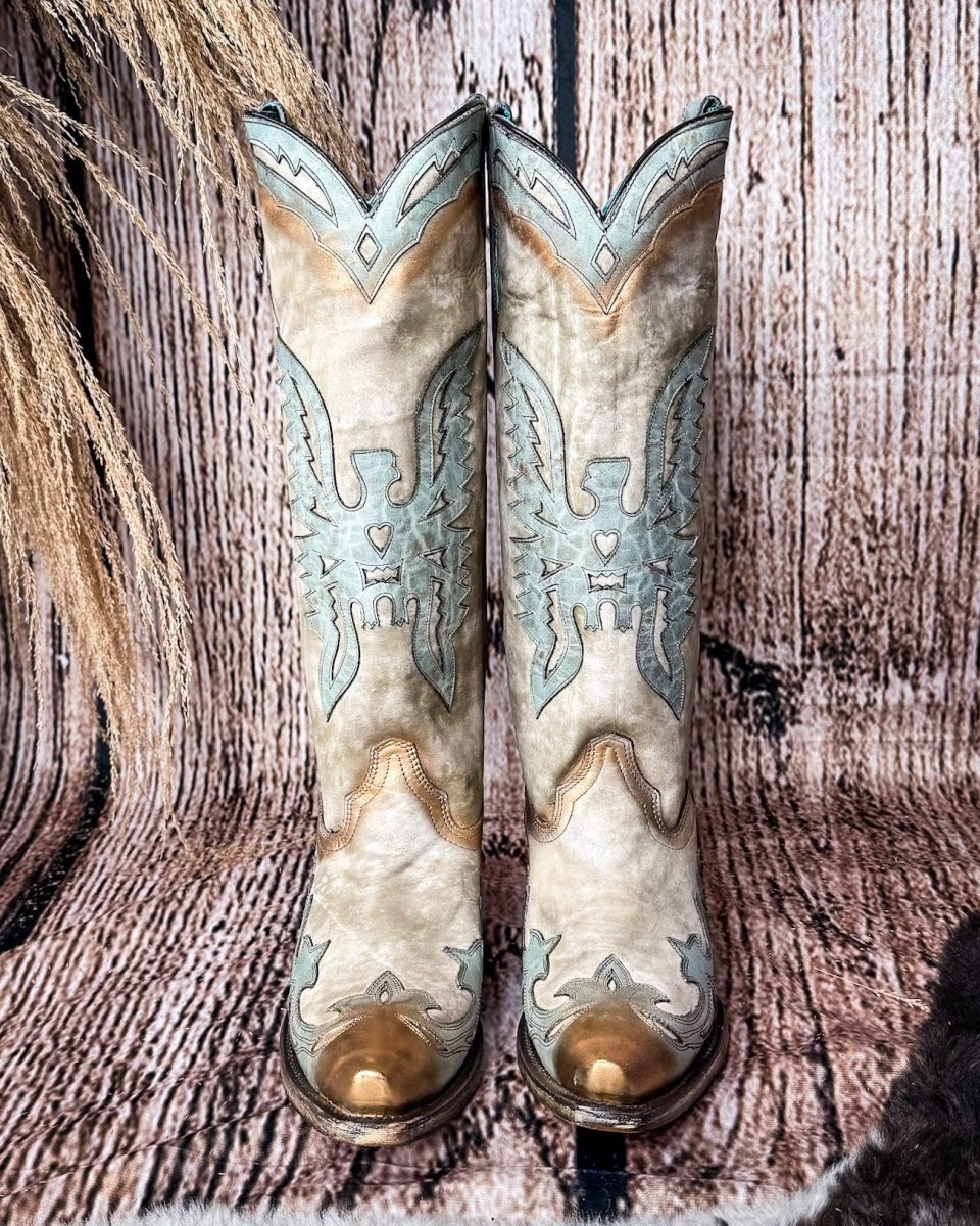 Crafted from premium cowhide leather in a soft vintage bone tone, these boots offer a sleek and elegant base that beautifully showcases the intricate eagle overlay wrapping the 15½-inch tall shaft. The detailed eagle symbolizes power and soaring ambition, creating a centerpiece that stands out in any crowd. The snip toe adds a refined, contemporary touch to the silhouette, combining style with comfortable wearability.