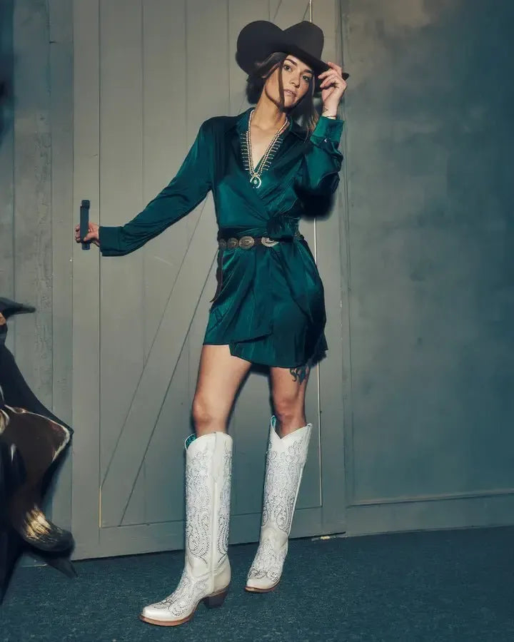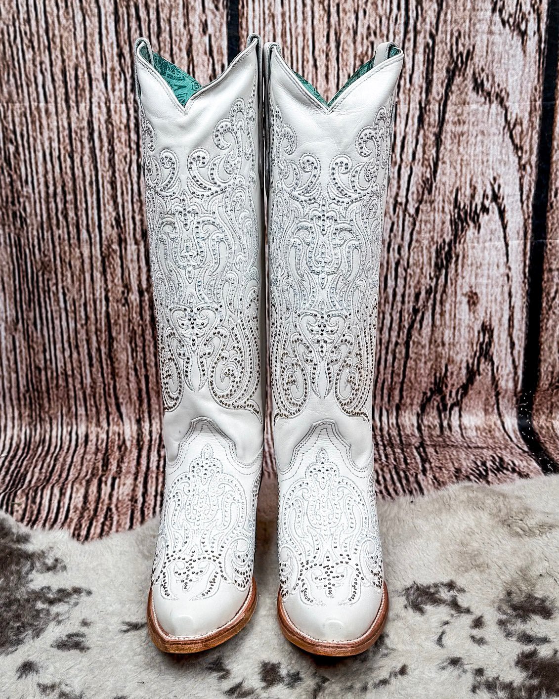 Corral + Circle G boots ship directly from the manufacturer, so please allow 7–14 business days for your order to hit the road. Good things take time—and trust us, these boots are worth it. These boots ship from the maker and must go to a physical address. No PO Boxes, please!Glamorous, graceful, and full of shine—the Starlita in White Crystal Boots by Corral are pure elegance with a western twist. Designed in soft white leather and detailed with tonal overlay and light-catching crystals, these tall beauties are made to stand out—whether you’re saying "I do" or stealing the spotlight on your next night out.