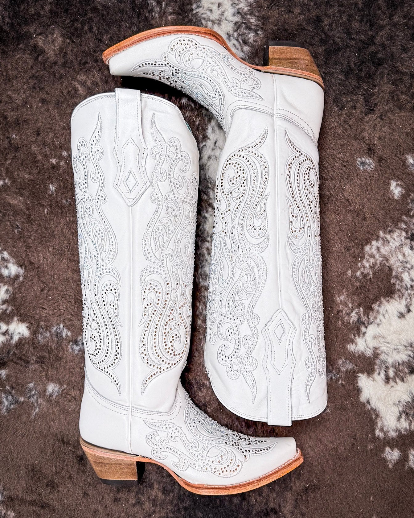 Glamorous, graceful, and full of shine—the Starlita in White Crystal Boots by Corral are pure elegance with a western twist. Designed in soft white leather and detailed with tonal overlay and light-catching crystals, these tall beauties are made to stand out—whether you’re saying "I do" or stealing the spotlight on your next night out.