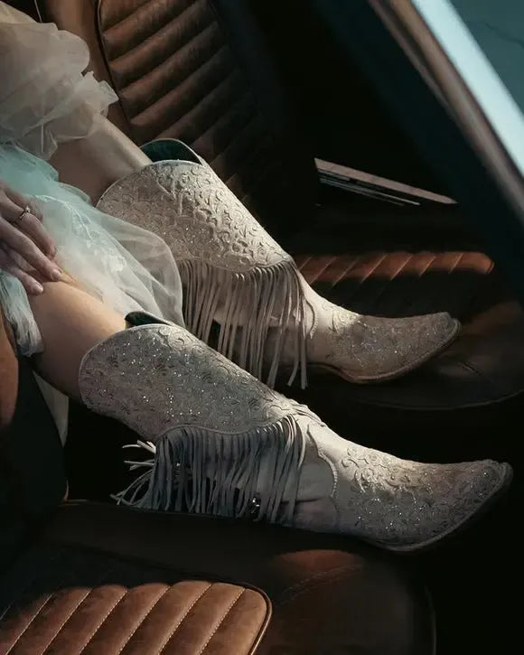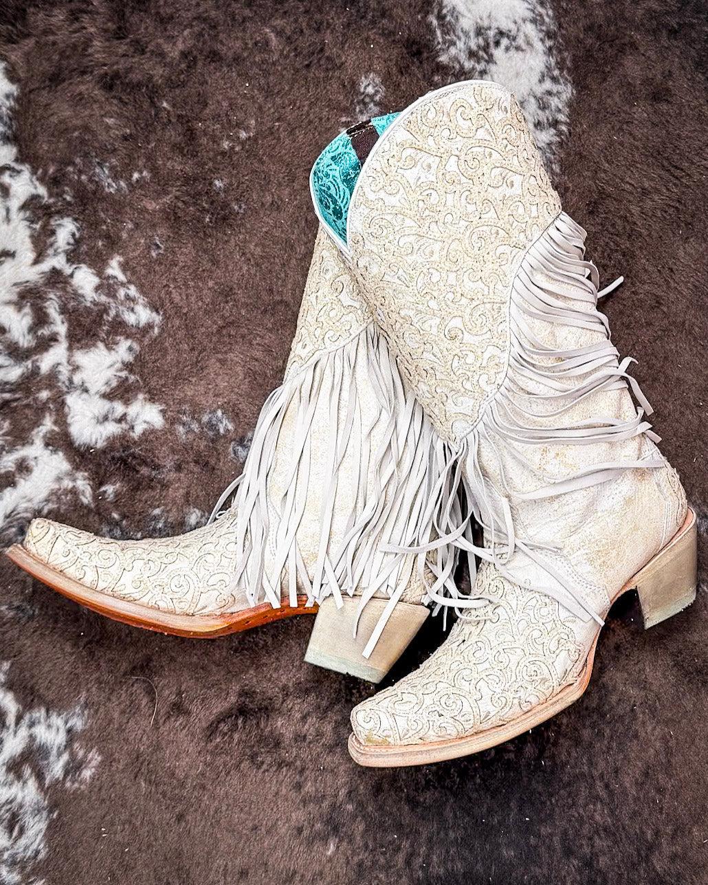 Corral + Circle G boots ship directly from the manufacturer, so please allow 7–14 business days for your order to hit the road. Good things take time—and trust us, these boots are worth it. These boots ship from the maker and must go to a physical address. No PO Boxes, please!Playful meets polished in the Velorosa in White Fringed Boots by Corral. With a softly shimmering embroidered overlay and full fringe swingin' down the side, these boots are made to move with you—whether you’re twirling on the dance floor or walking down the aisle. The white lamb leather adds a luxe feel, while the 13" shaft brings just the right amount of drama.