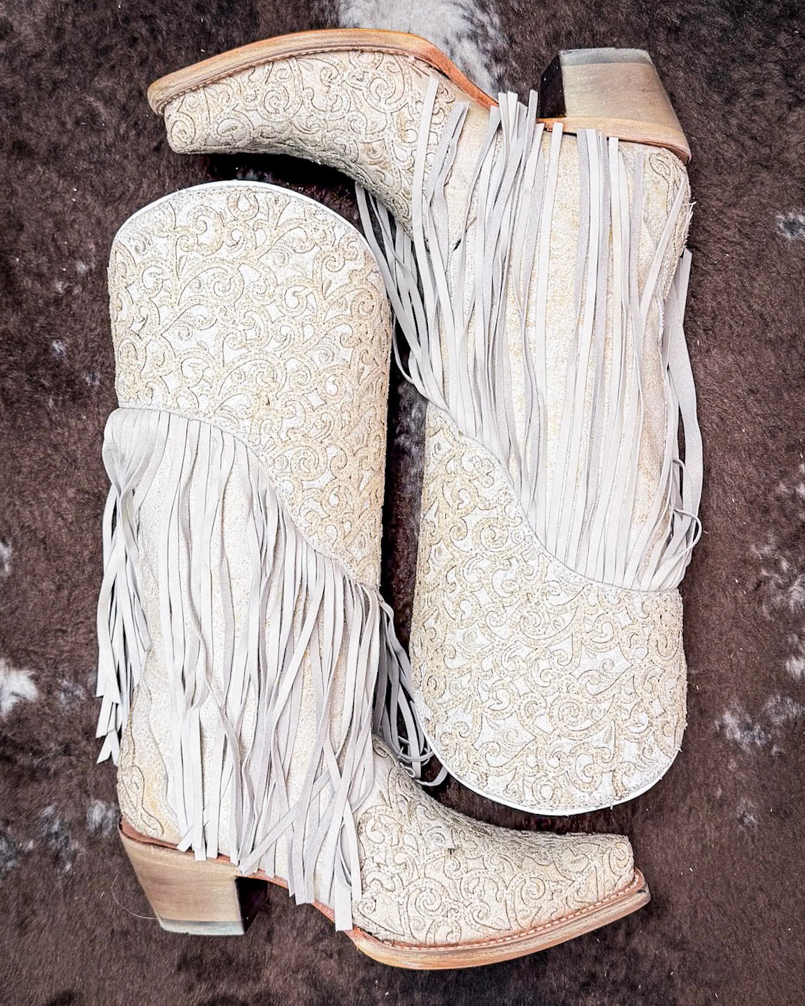 Playful meets polished in the Velorosa in White Fringed Boots by Corral. With a softly shimmering embroidered overlay and full fringe swingin' down the side, these boots are made to move with you—whether you’re twirling on the dance floor or walking down the aisle. The white lamb leather adds a luxe feel, while the 13" shaft brings just the right amount of drama.