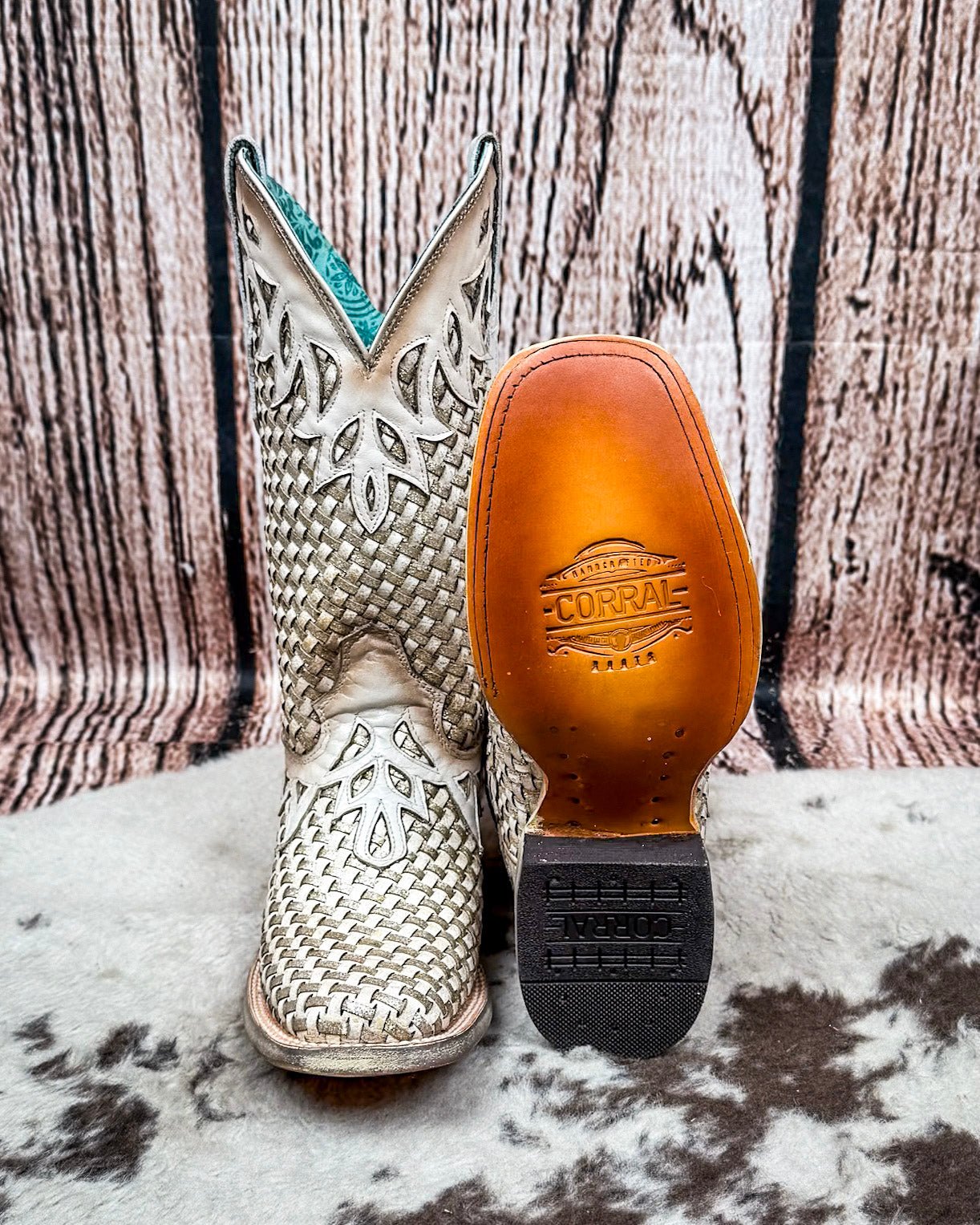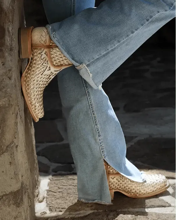 Light, classic, and just the right amount of shine—the White Canyonette Boots by Corral blend timeless western structure with an elevated woven finish. With a soft white color and subtle glitter accents, the textured basketweave pattern wraps the vamp and shaft, while delicate overlays bring in a refined touch of western flair. They're eye-catching without being over the top, and they pair effortlessly with just about everything in your closet.