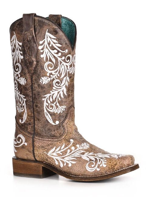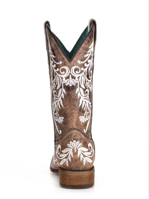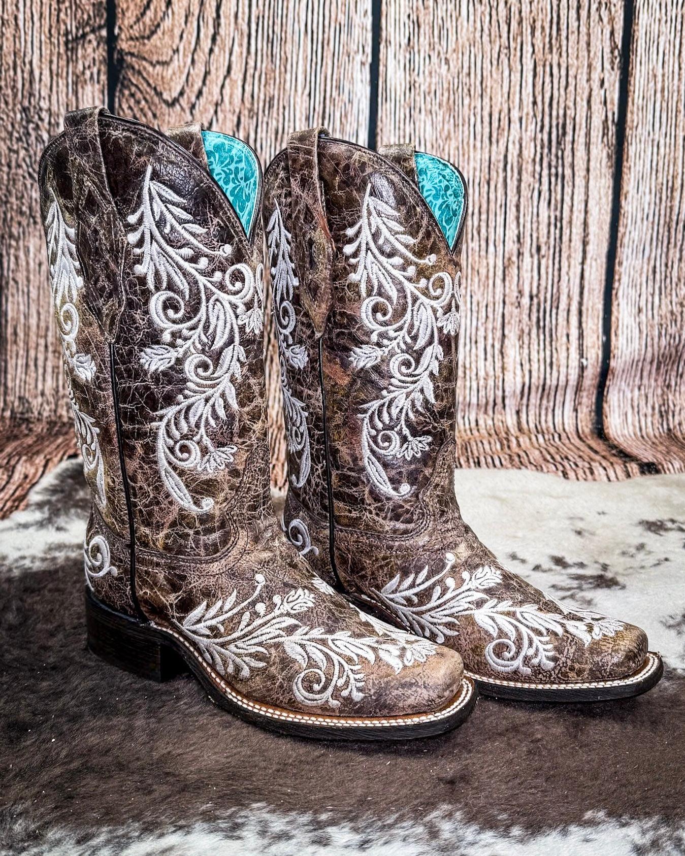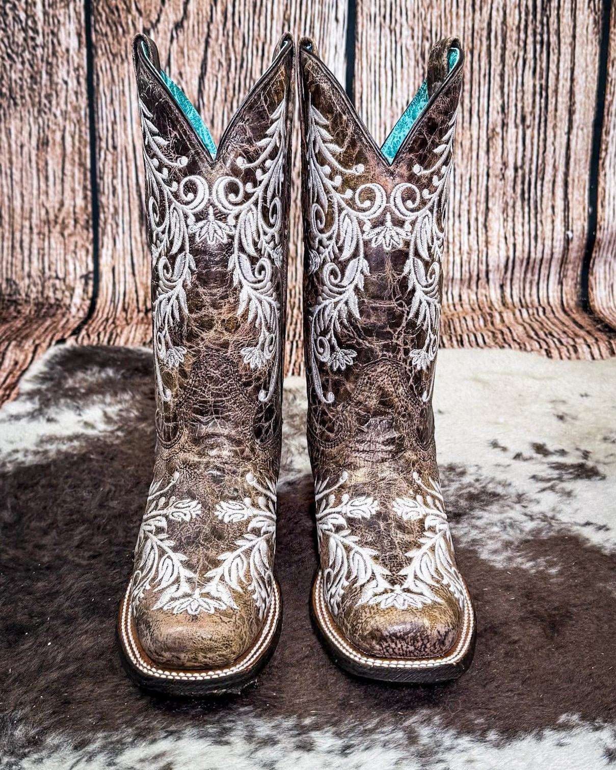 Made from genuine cowhide leather, the vamp carries a naturally distressed finish that tells its own story. It’s rich, rugged, and full of character—perfect for the days when you want your boots to work hard and look even better doing it. The real eye-catcher, though, is the bold white embroidery that winds across the shaft and toe like delicate wildflowers dancing in a breeze. It’s a look that’s both timeless and striking, adding just the right amount of detail without feeling fussy.