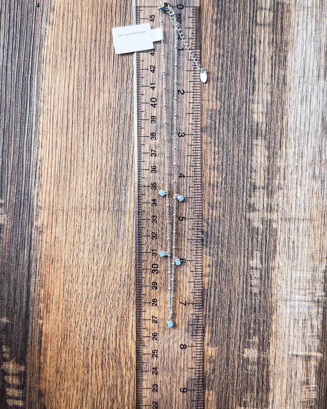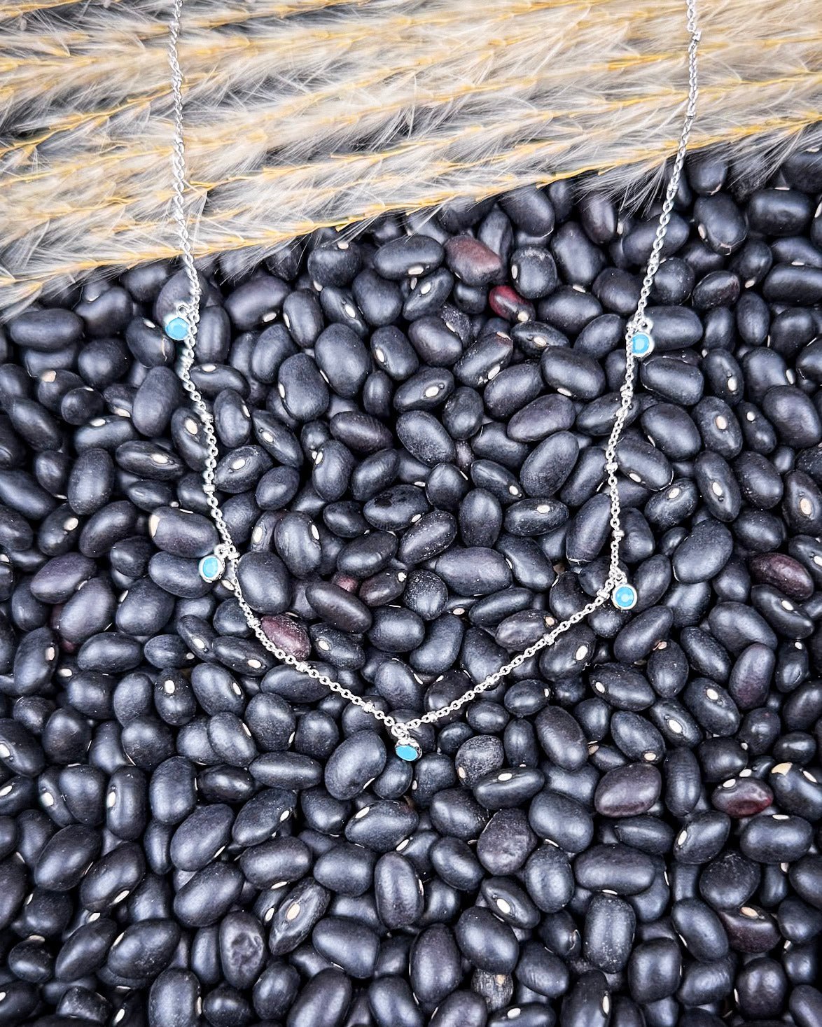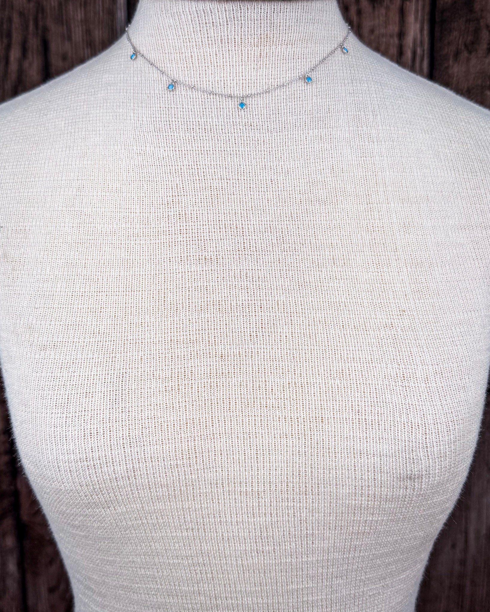The design features small turquoise-hued howlite stones set in sterling silver bezels, evenly spaced along a fine sterling silver chain. These tiny stones shimmer softly as they catch the light, offering a subtle pop of that signature blue tone we all love in turquoise. The result is an understated piece that still feels playful, modern, and fresh.