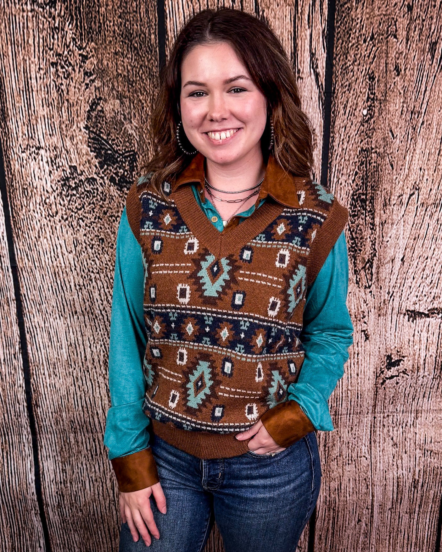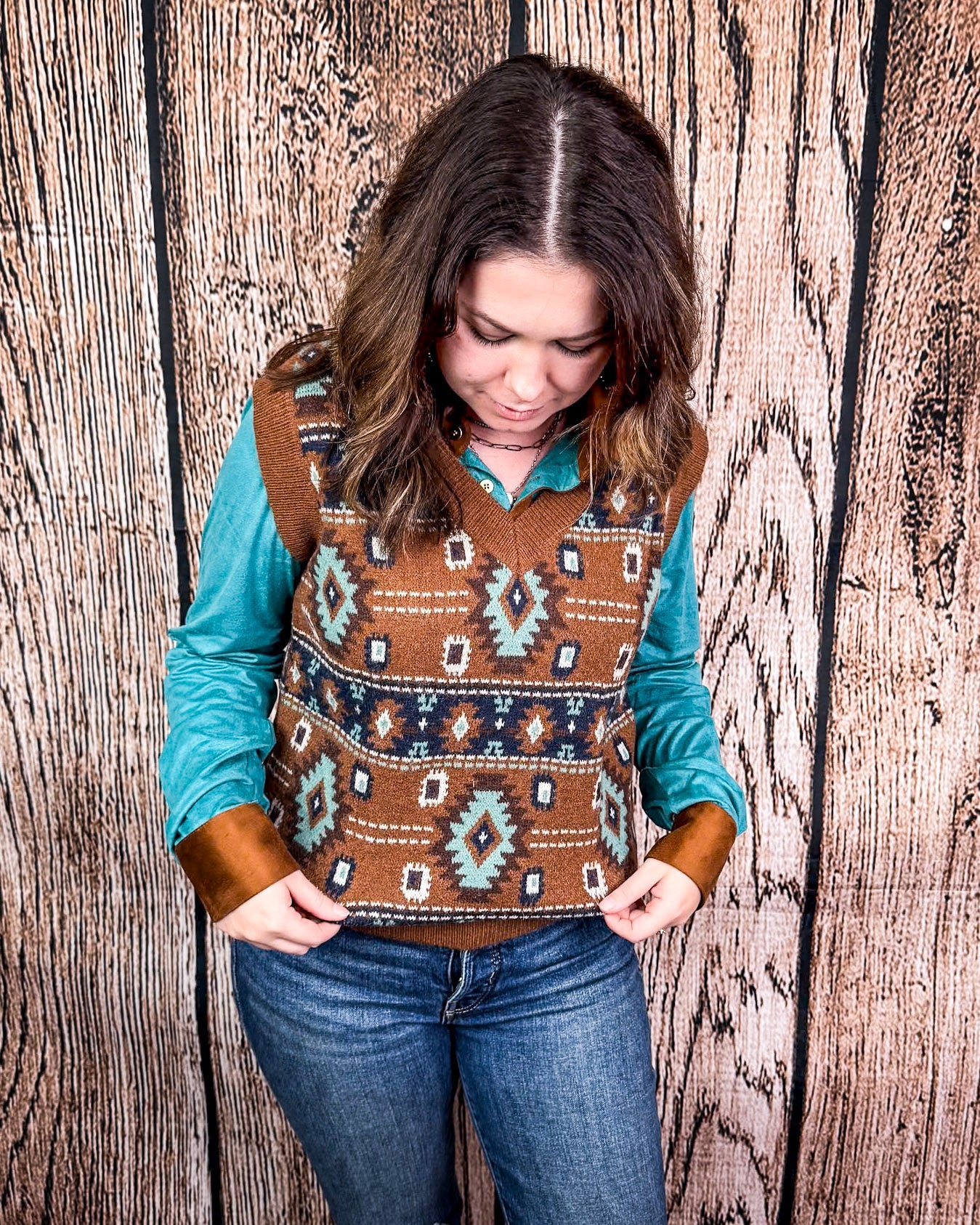 Western-inspired knit vest in turquoise, navy, and brown tones