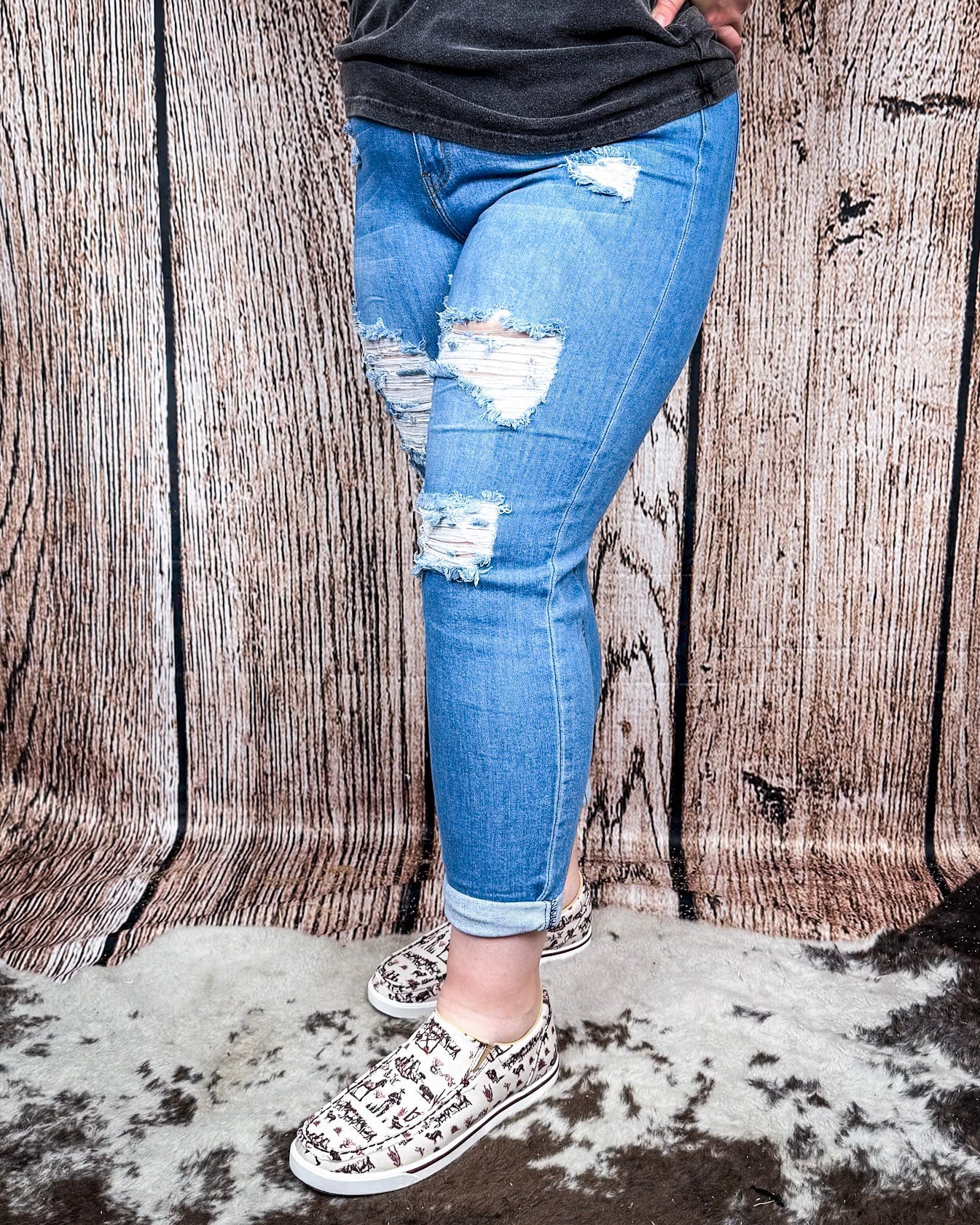 Follow your own path in the Coyote Trail High-Rise Mom Jeans, where rugged charm meets effortless cool. Inspired by the raw beauty of the open range and the rebellious spirit of the West, these jeans are built for women who embrace edge, ease, and individuality. Distressed in all the right places and designed for all-day comfort, this pair brings a worn-in look with a well-loved feel straight from the first wear.