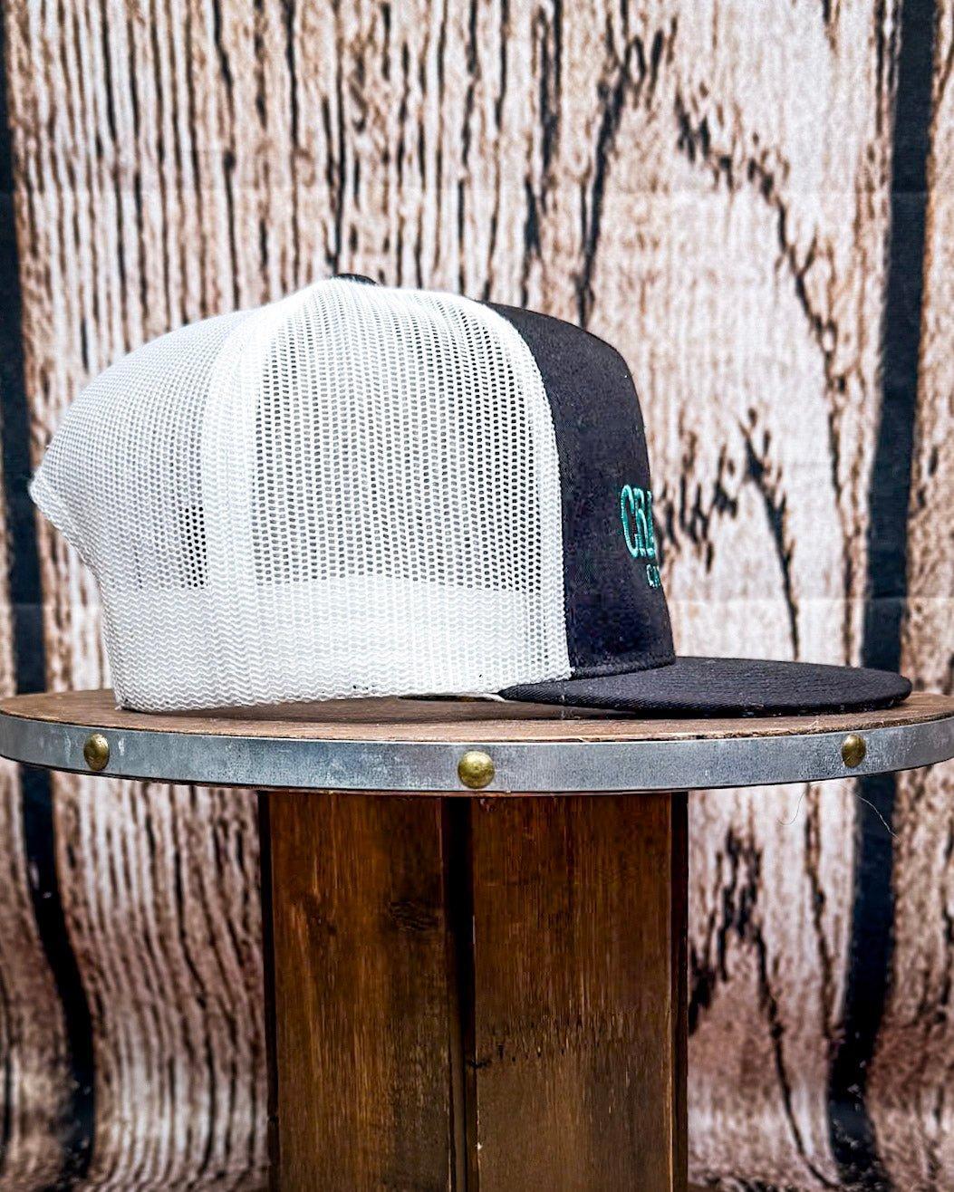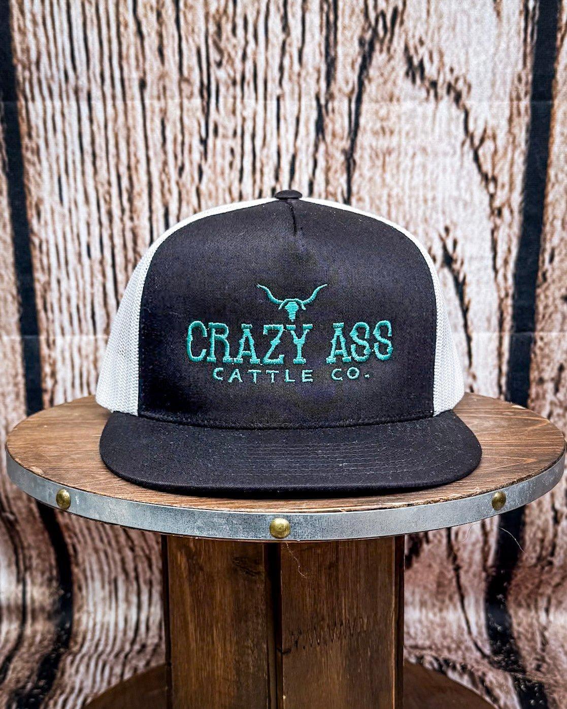 Designed for laid-back comfort with a whole lotta attitude, this trucker cap features a bold Crazy Ass Cattle Co. graphic in turquoise embroidery across the front. That pop of turquoise against the black front panel? Straight fire. Add in the white mesh back and classic snapback fit, and you’ve got a go-to hat that’ll have folks asking where you got it.