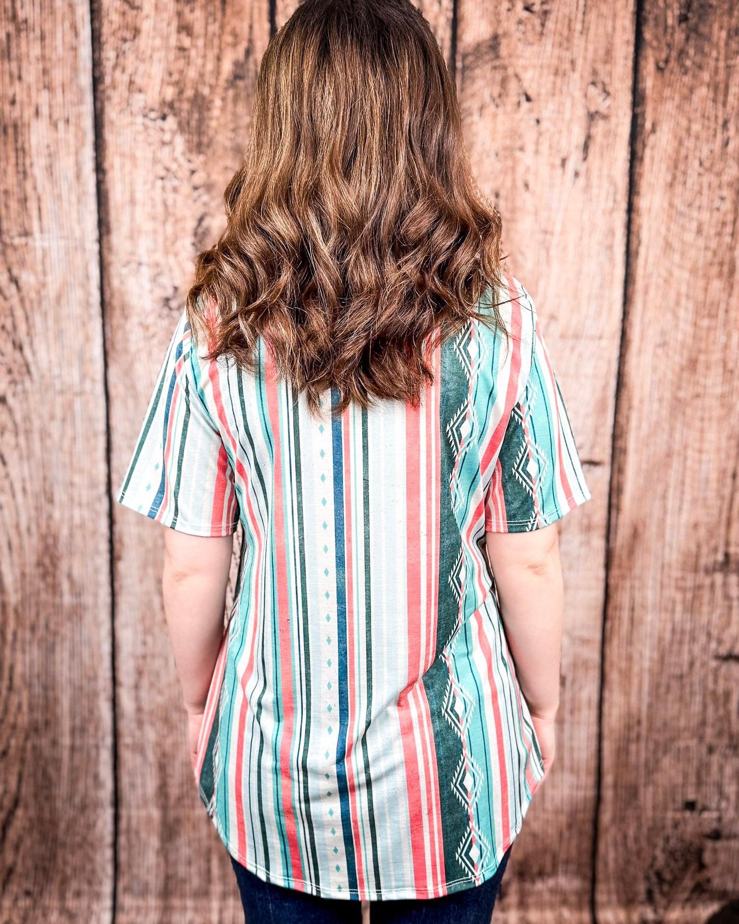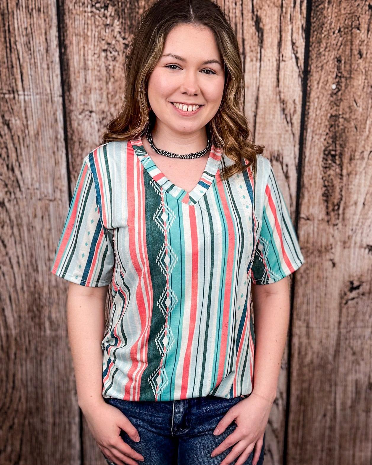 The Dalia Mint and Coral Serape Print Short Sleeve V-Neck Top is one of those pieces that just makes getting dressed feel easy. It’s got the kind of laid-back charm and effortless style that fits right in whether you’re headed to brunch with the girls, a weekend market stroll, or just soaking up some sunshine on the porch swing.