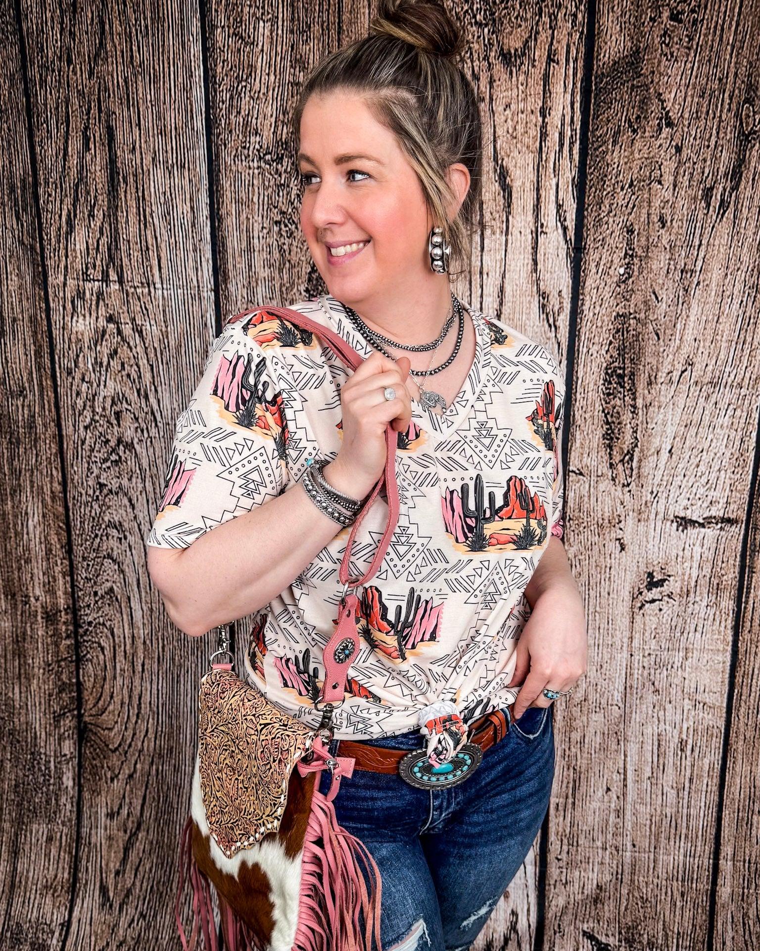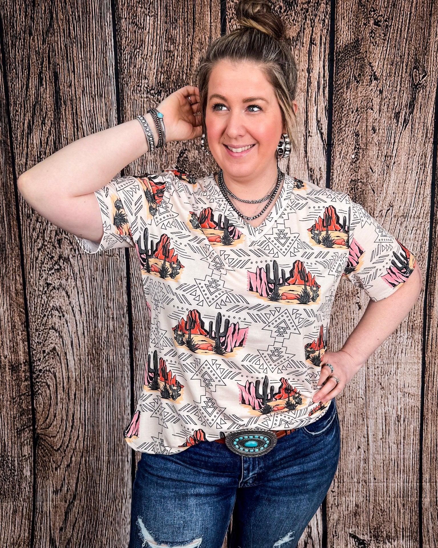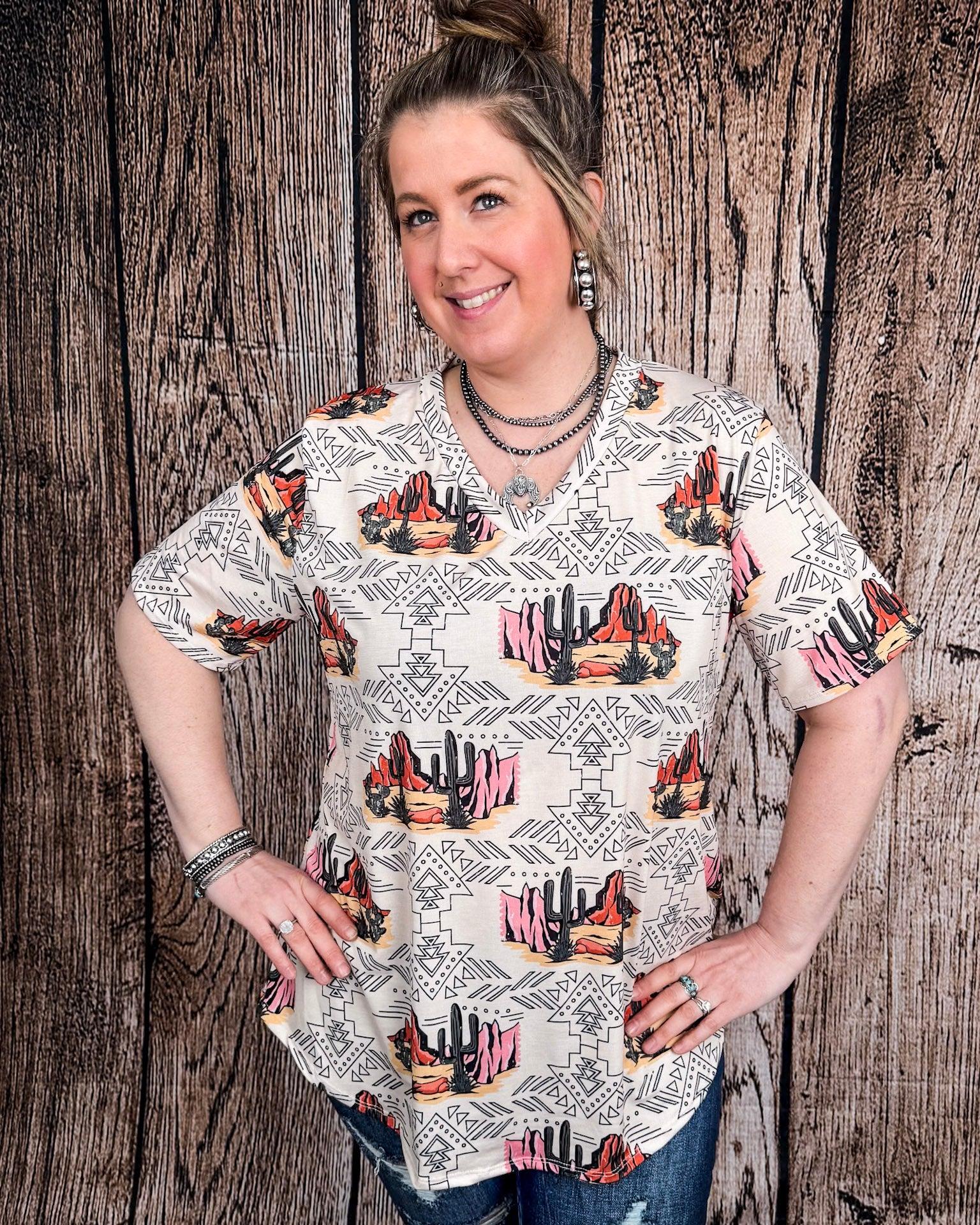 Some pieces just feel like home the second you slip them on — like desert air in your lungs and sunshine on your shoulders. The Dune Desert Print Short Sleeve V-Neck Top by Lucky & Blessed is one of those pieces. Made for the ones who find beauty in wide open spaces and who chase sunsets with dust on their boots, this top is the perfect blend of comfort, character, and western charm.