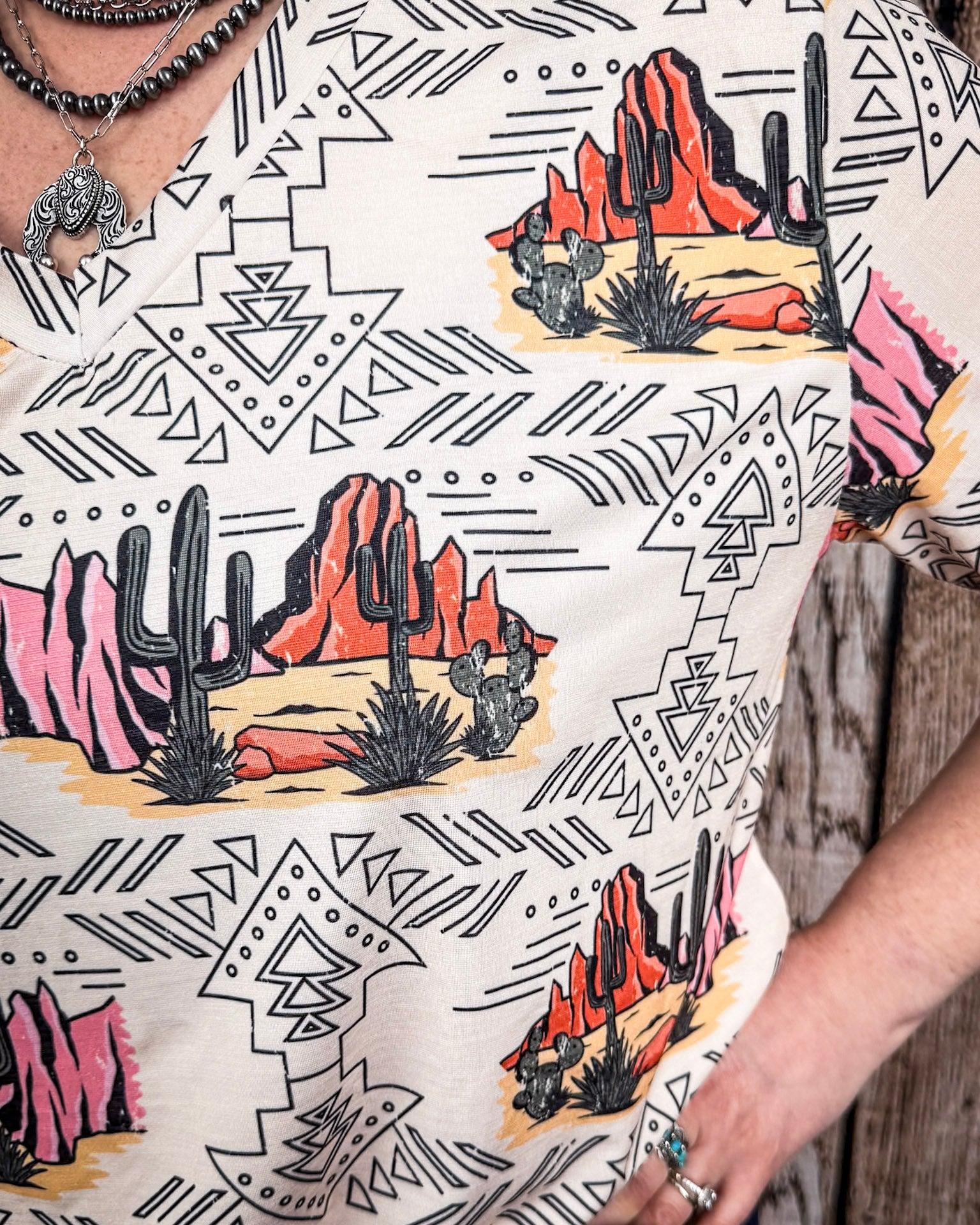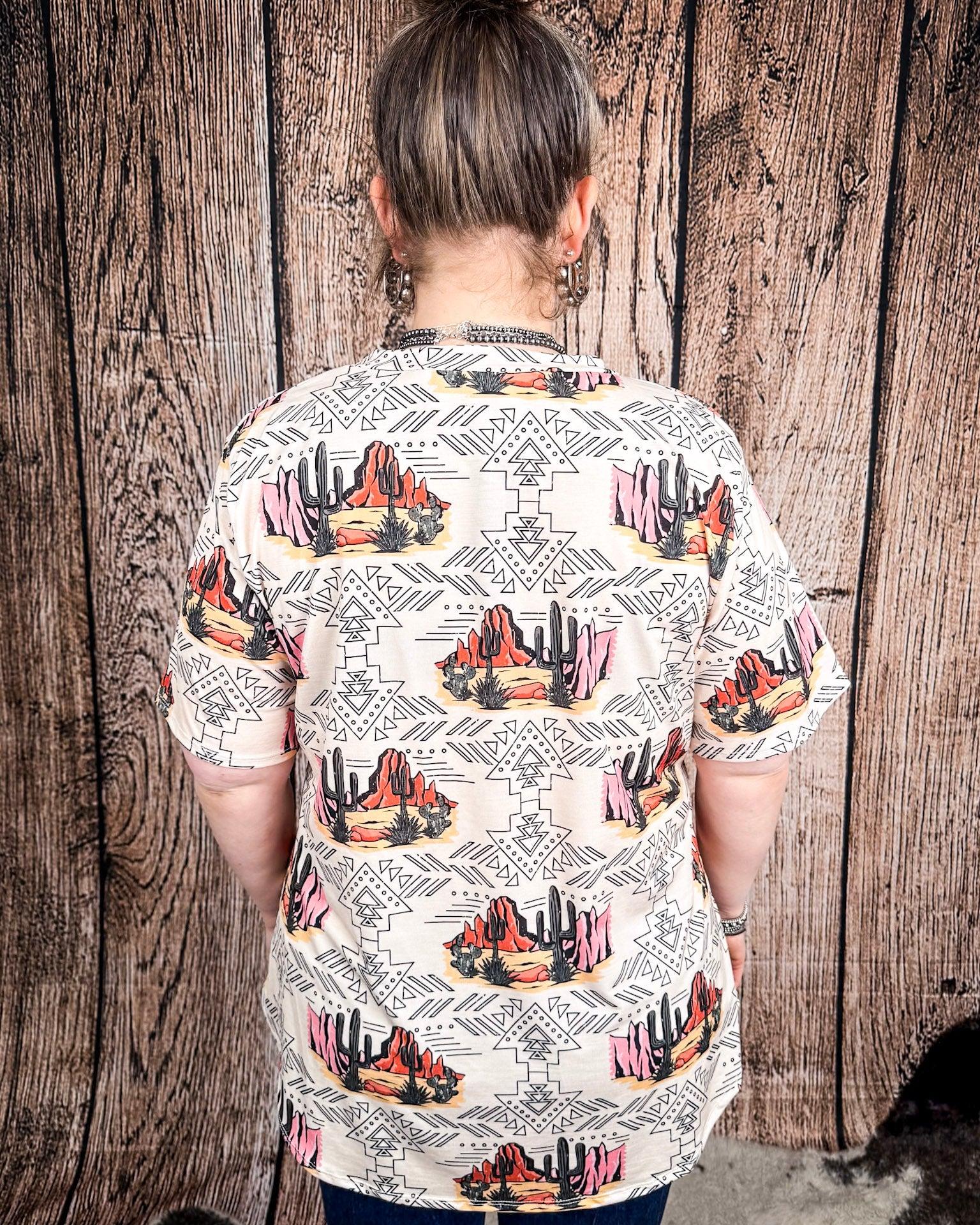 But what really makes this piece stand out is the desert-inspired print that feels straight out of a roadside daydream. With rugged rock formations, towering cacti, and dusky skies painted in warm tones of rust, blush, and sage, it captures the spirit of the Southwest in a way that’s both bold and wearable. Layered atop a subtle geometric background with hints of tribal influence, it’s the kind of design that tells a story — one of open roads, soft winds, and freedom in every direction.