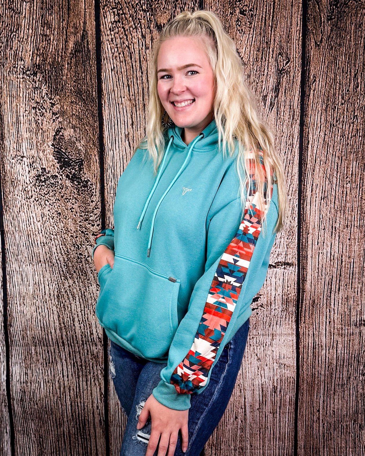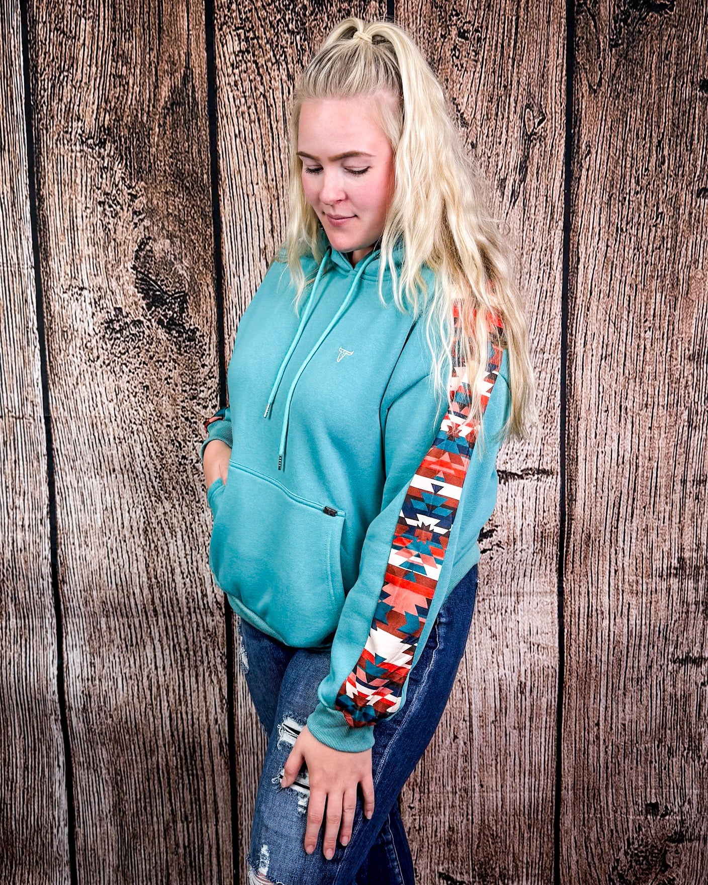Meet the hoodie that’s got just as much attitude as it does comfort. The Fast Draw Aztec Hoodie is your go-to for those days when you wanna stay cozy and make a statement. With a vibrant coral, navy, and cream Aztec pattern running down each sleeve, this turquoise pullover doesn’t play it safe—and that’s exactly why we love it.