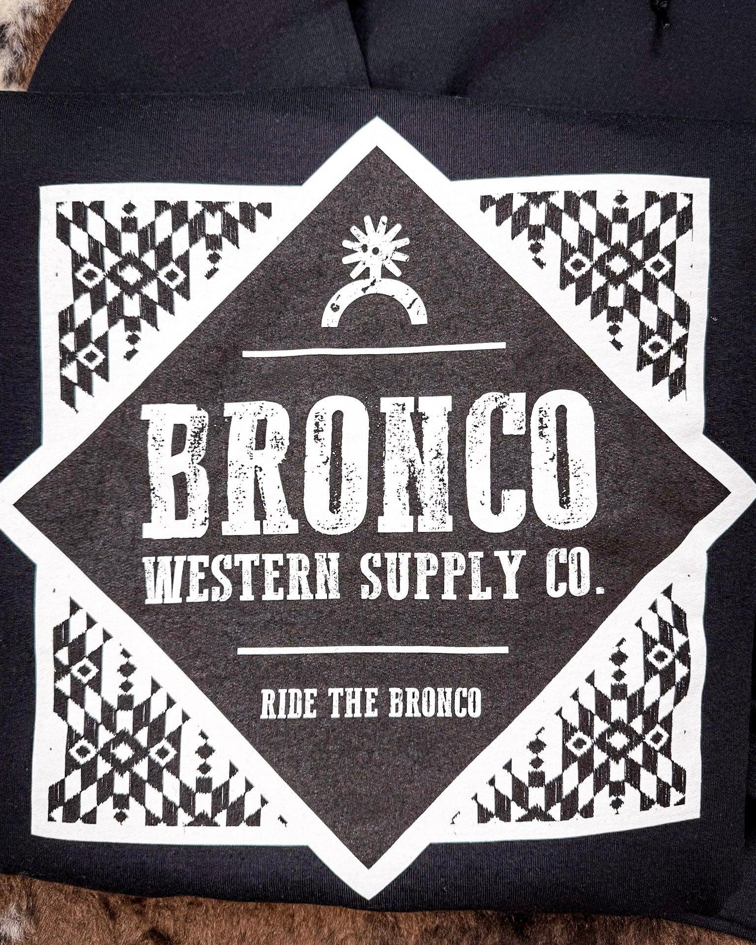 On the chest, our Spur Up logo keeps it minimal and meaningful. Then the back brings the heat with our oversized Bronco Western Supply Co. graphic, framed in a bold, bandana-style print. It’s a nod to tradition with a modern edge—and it turns a simple black hoodie into something that tells a story.