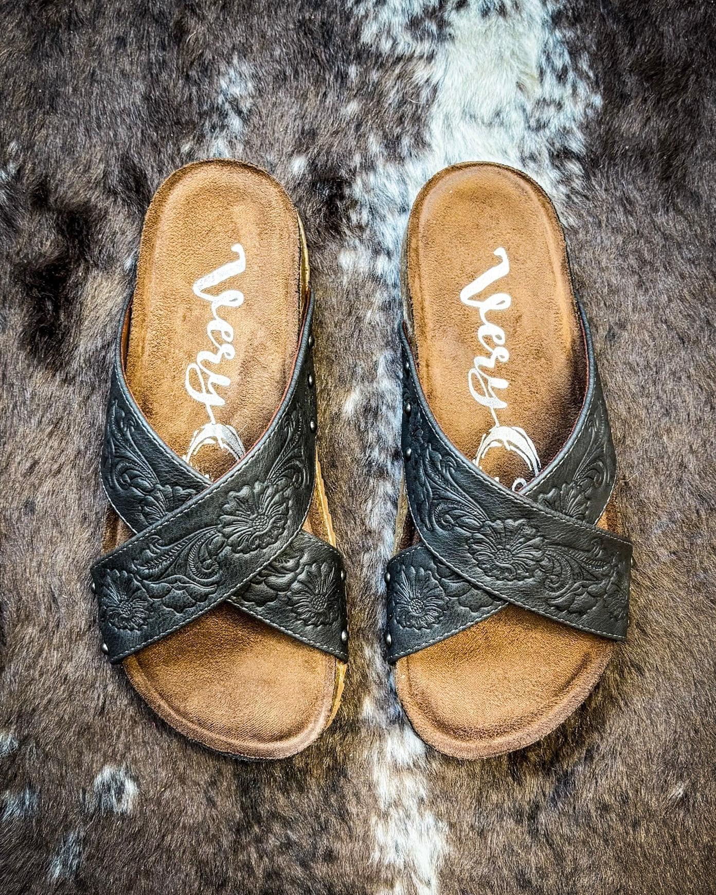 Introducing the Jaycee Sandals by Very G, where classic Western charm meets modern comfort in every step. These slip-on sandals redefine casual elegance with their timeless design and luxurious embossed leather top, making them an essential addition to any wardrobe. Designed for those who appreciate both style and function, the Jaycee Sandals effortlessly blend intricate craftsmanship with everyday practicality.