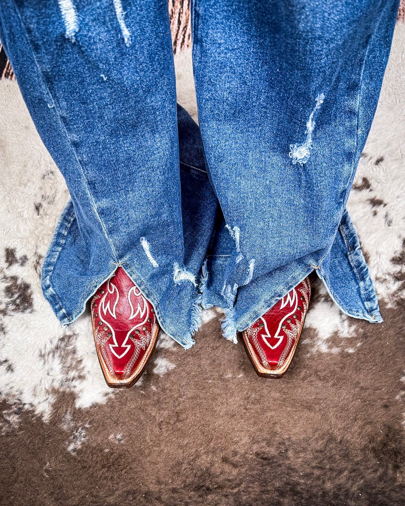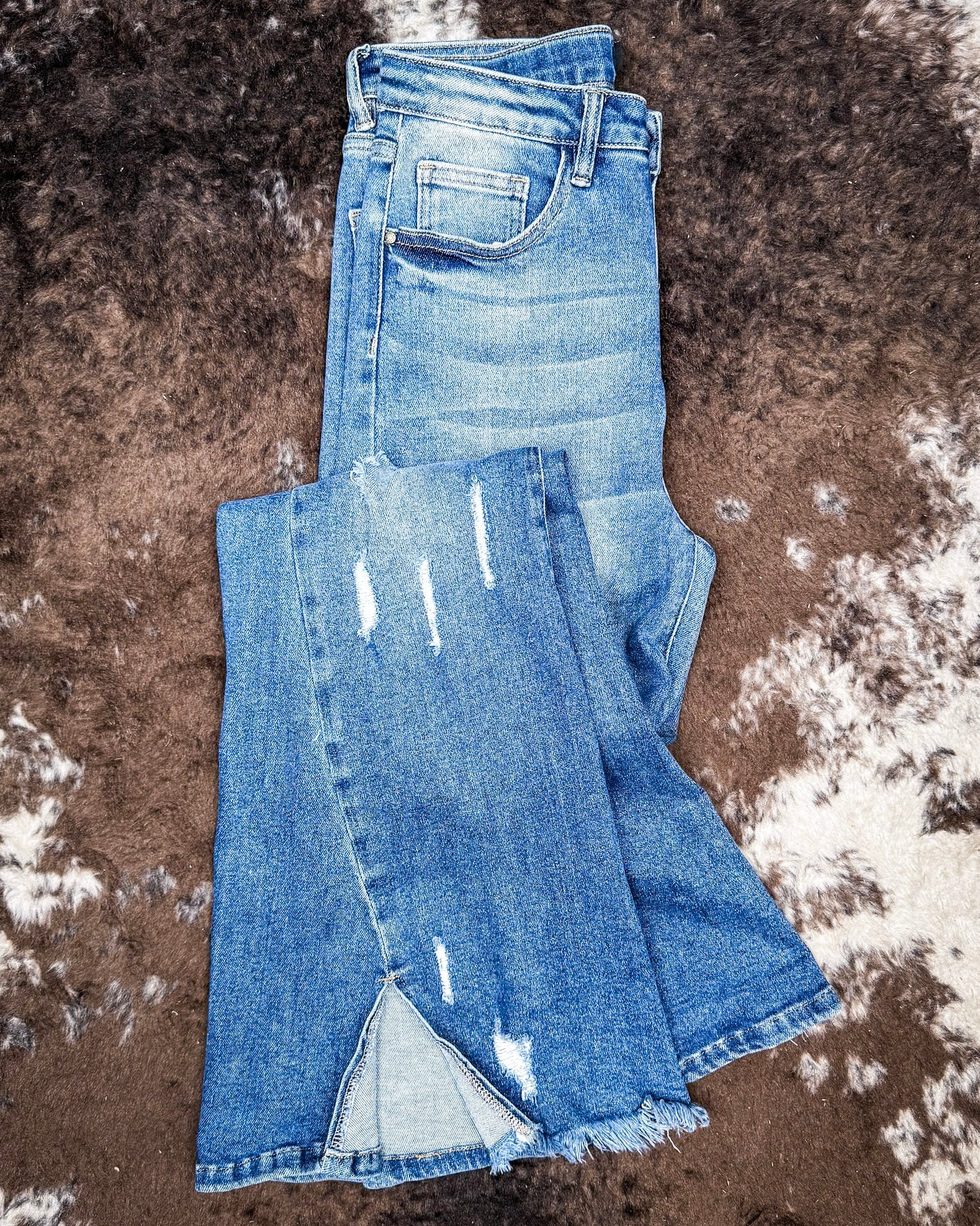 The Jordan High Rise Medium Wash Distressed Flare Jeans deliver the perfect blend of rugged Western attitude and figure-flattering design. With their dramatic flare, bold front slits, and broken-in distressing, these jeans don’t just make an entrance—they make a statement.
