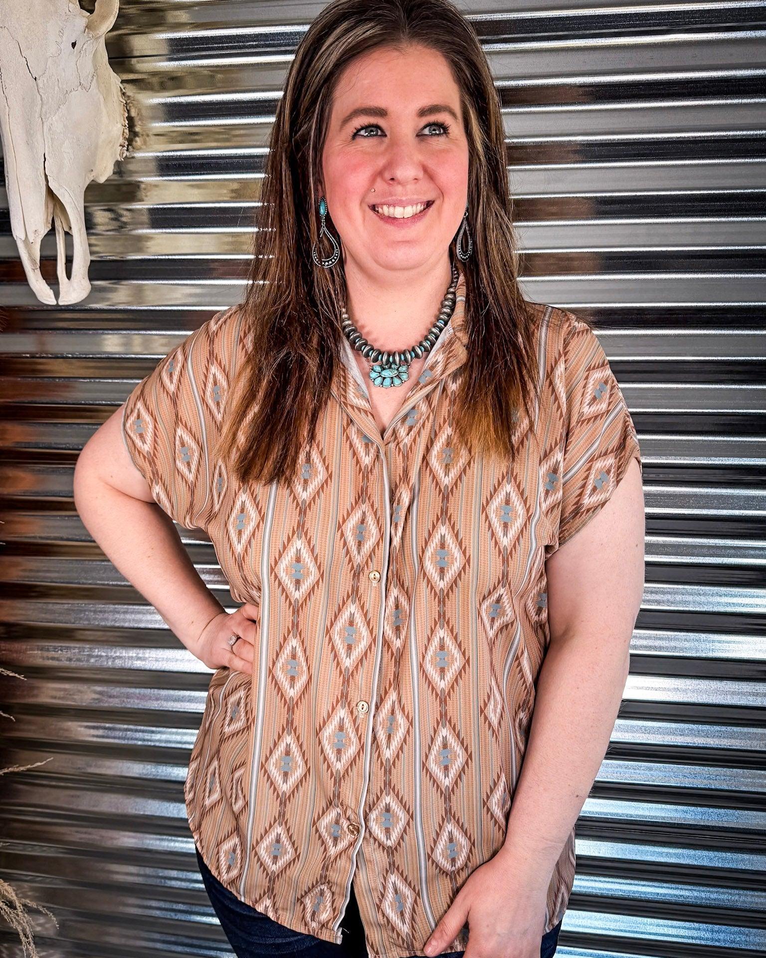 A little rugged, a little refined—the Josie Khaki Aztec Dolman Short Sleeve Button Down Top is Western charm wrapped in effortless style. With its earthy khaki base and a striking dusty blue and rust Aztec print, this top is made for the free-spirited cowgirl who loves timeless style with a touch of adventure.