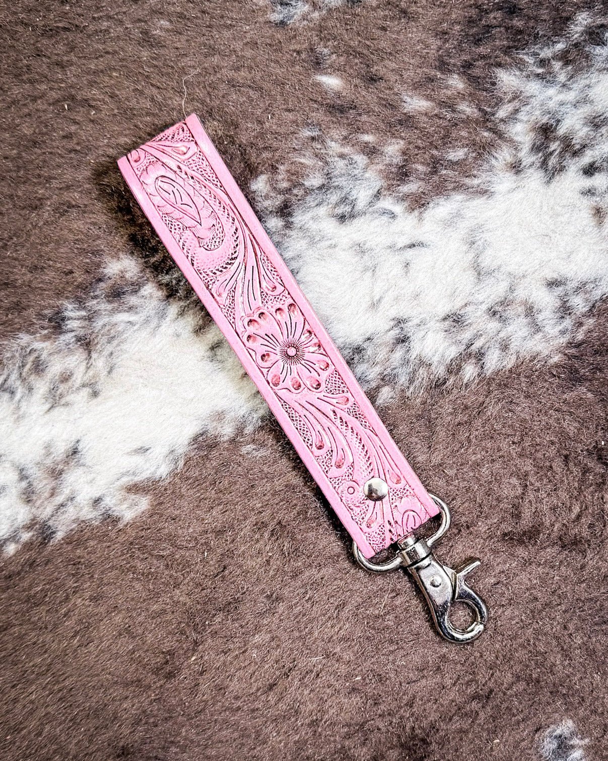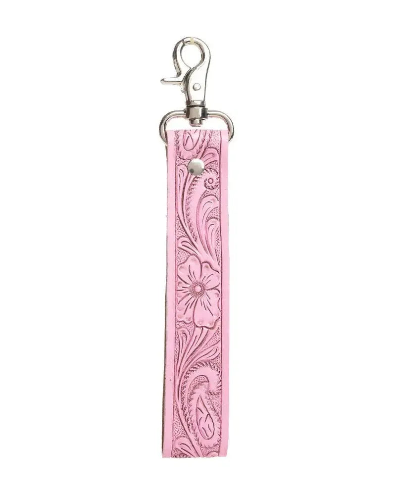 Crafted from genuine leather and hand-tooled with a delicate floral pattern, this key fob feels like a fresh spring morning on the ranch. The soft blush pink hue adds just the right pop of color—feminine without being fussy, and grounded in that rugged-meets-refined western charm we love. It’s got a sweet, vintage spirit to it, but make no mistake—this piece is made to last.