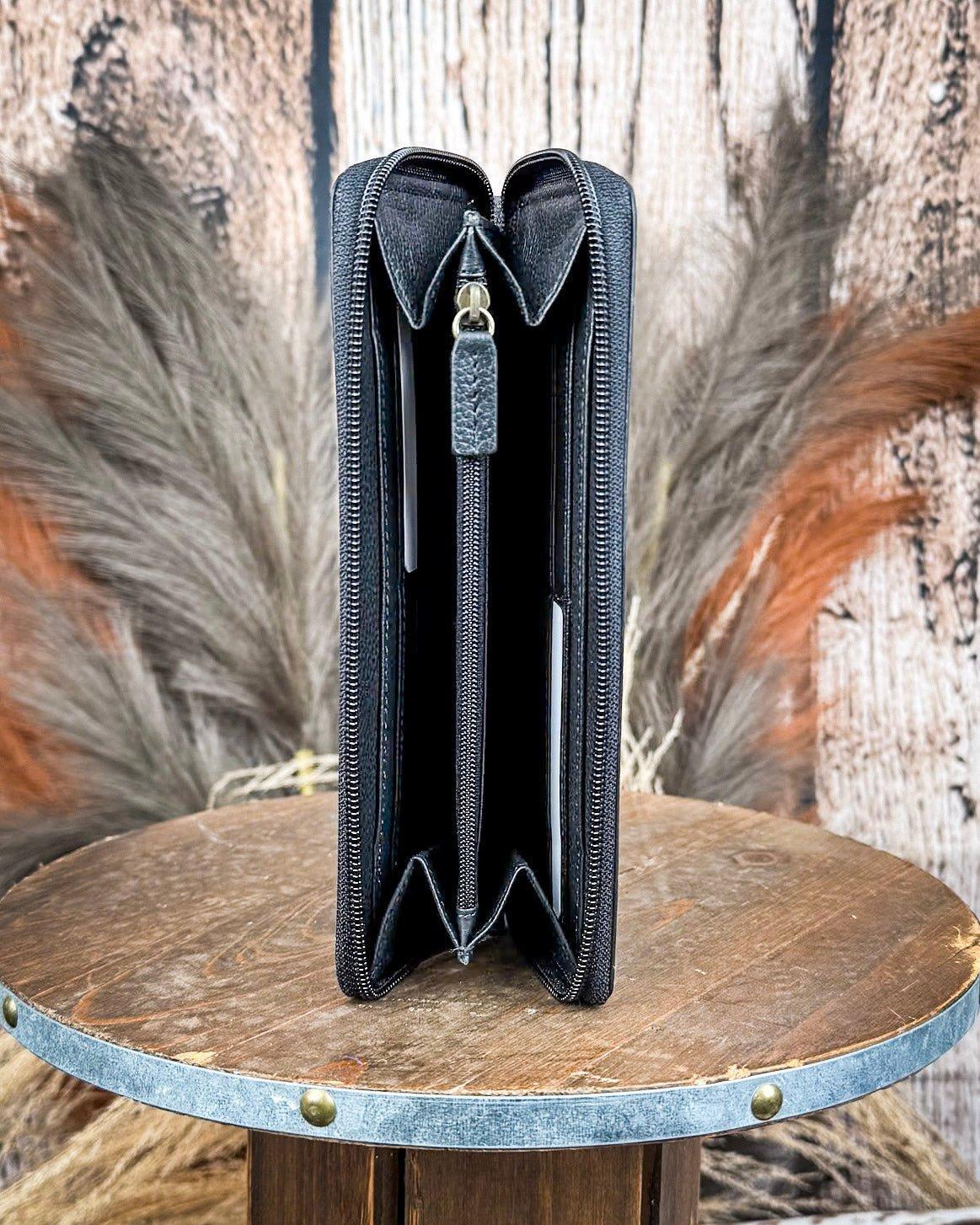 The blend of sleek black leather and warm embossed details gives this wallet a classic-meets-modern feel—perfect for pairing with your favorite tooled leather bag or wearing as a statement piece all on its own. The durable zip, finely stitched edges, and handcrafted tooling make it a practical yet artful investment that you’ll reach for day after day.