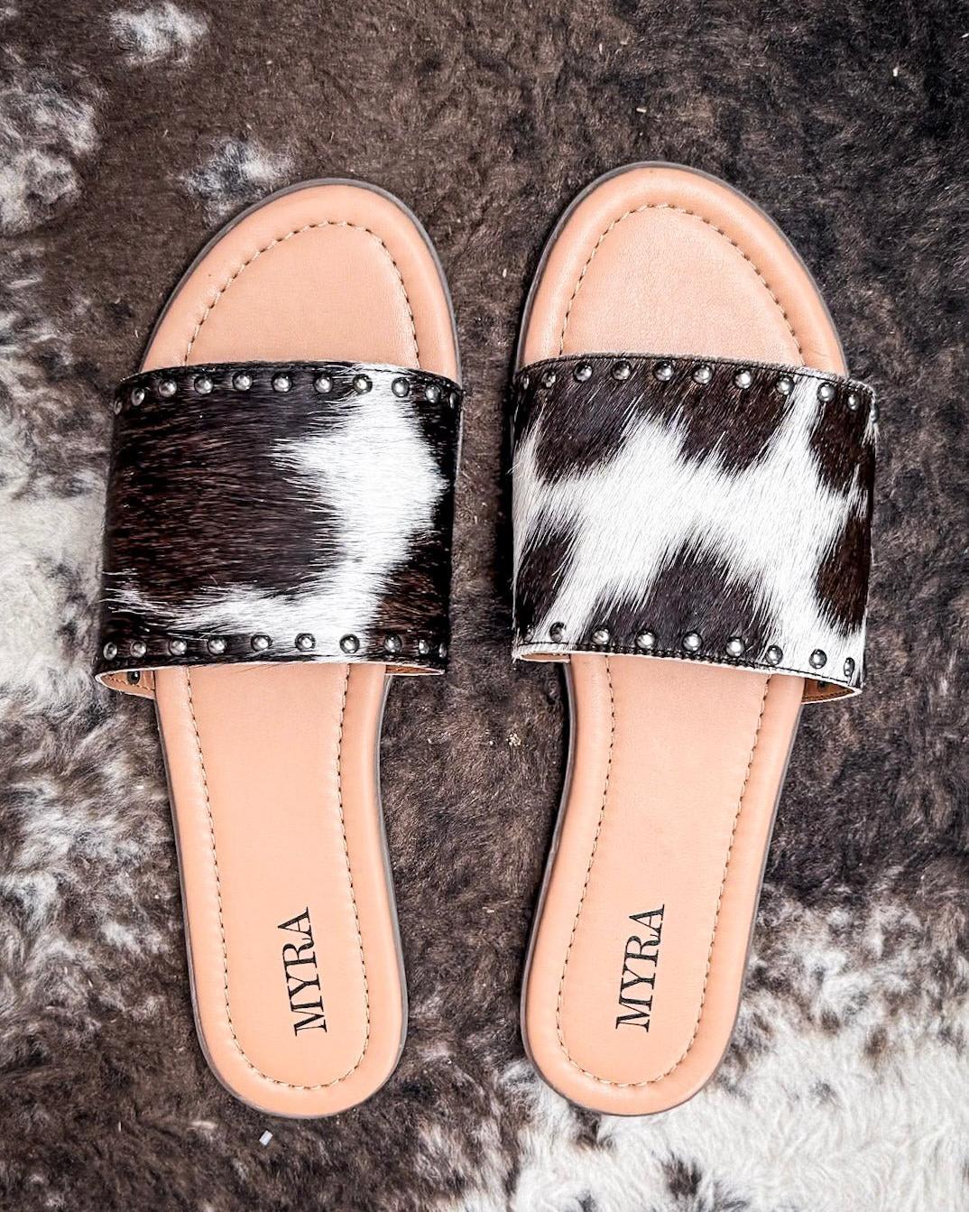 Bold, beautiful, and built for everyday wear—The Lettie Ridge Slides in Dark Hide bring a touch of wild elegance to your step. Featuring a wide leather band wrapped in rich, dark hair-on hide, these slides are the definition of rustic refinement. Each pair is naturally unique, showing off the hide’s texture and tone in all its glory.