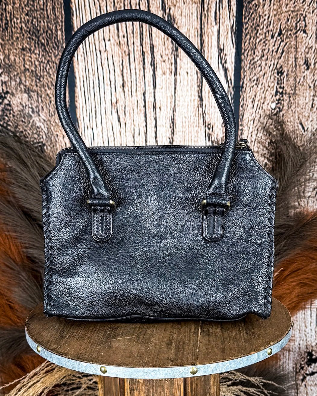 Every detail of this handbag speaks to intentional design and heritage craftsmanship. The stitched edge accents and brass-finish hardware lend authenticity and charm, while the all-black design keeps it sleek and fashion-forward.