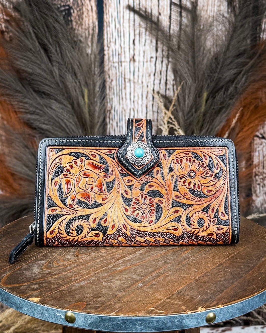 The Mysa Wallet features a stunning hand-tooled floral motif on rich leather, with intricate scrollwork that showcases the expertise of artisan leatherworkers. The front flap is adorned with a beautiful faux turquoise stone set into a decorative leather snap tab—an elegant nod to Southwestern influence and vintage Western charm. Framed by a contrasting dark leather border, the warm caramel and amber tones of the tooling truly pop, giving the Mysa Wallet its signature ornate look.