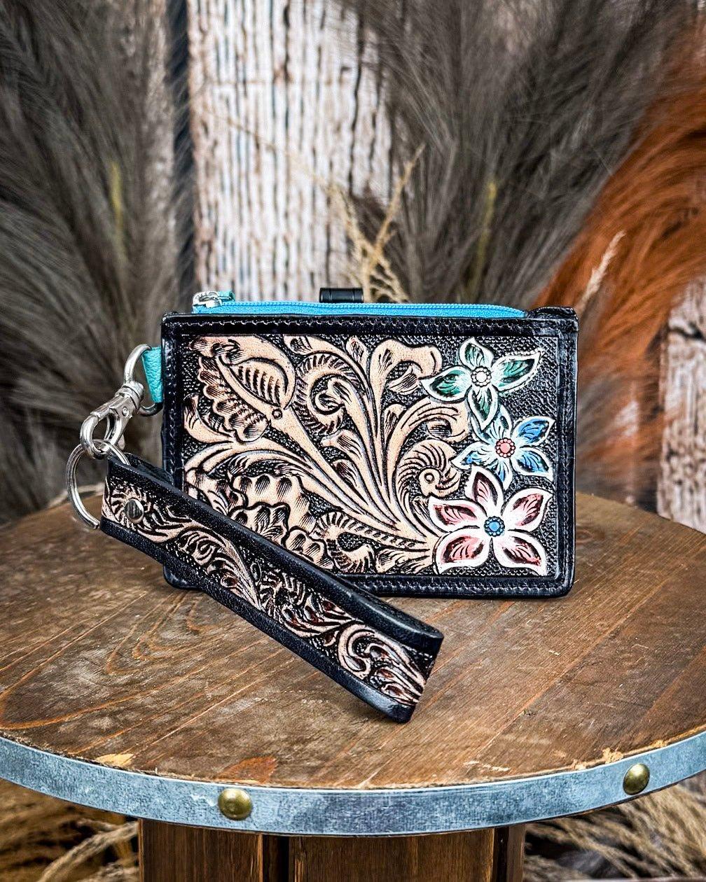 The front of the wallet features intricate, hand-carved floral patterns, each petal and leaf etched with care into premium black leather. Accented with hand-painted prickly pear cactus blossoms in turquoise, teal, and blush pink, the wallet is a perfect tribute to the untamed Southwest. The colorful design pops against the rich black leather backdrop, while the vibrant turquoise zipper adds an extra splash of personality.