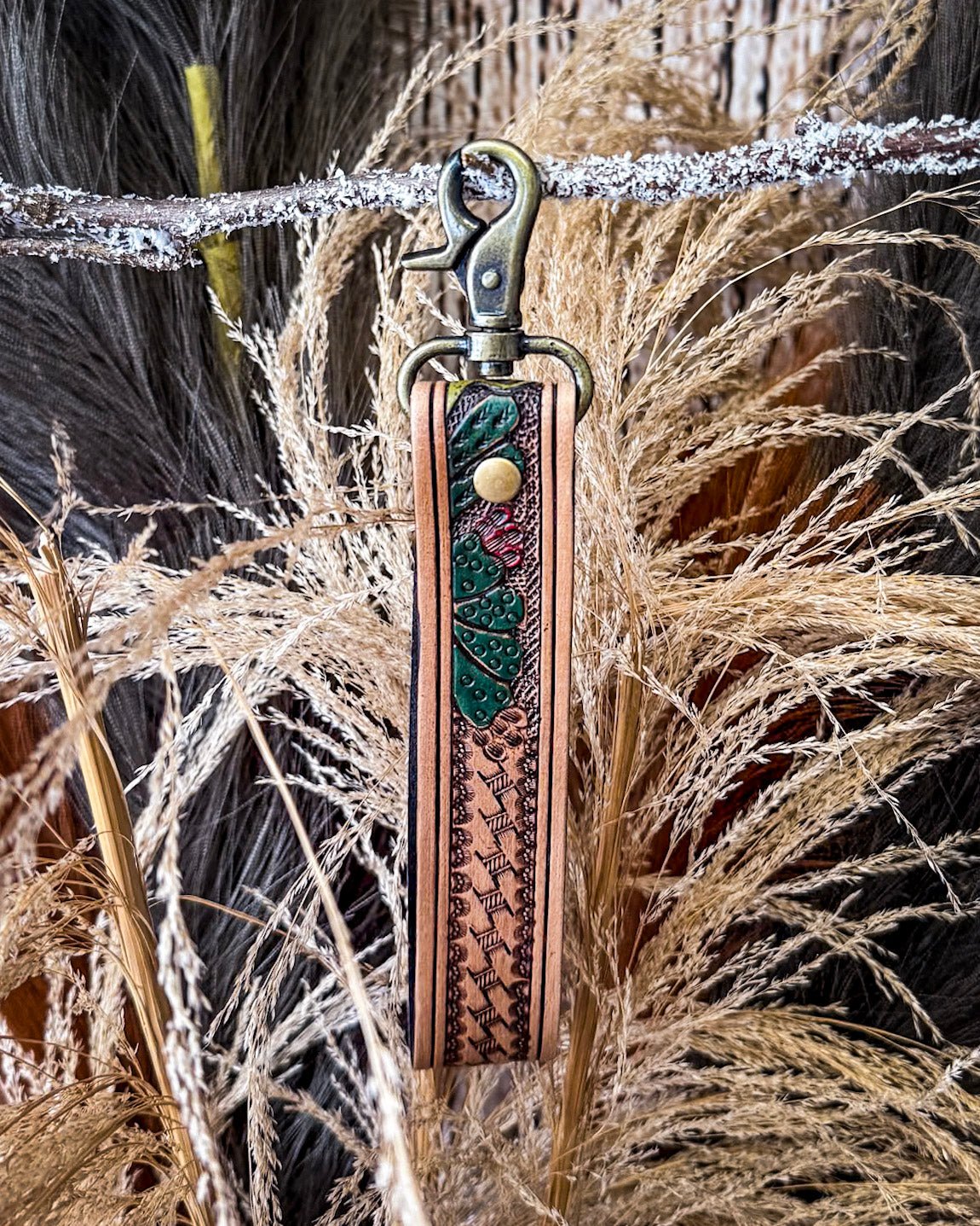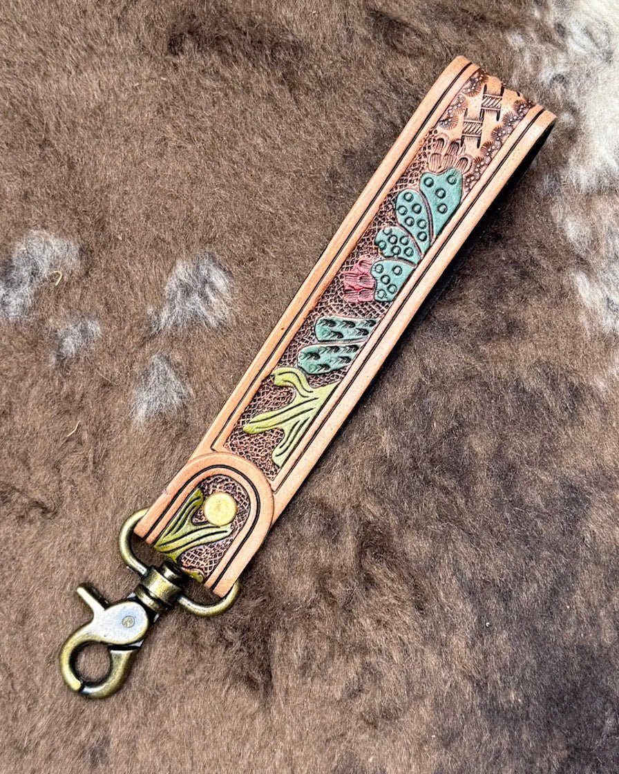 Crafted from genuine leather, the fob features intricate tooling inspired by desert landscapes and cactus blooms, adding a subtle touch of color. The warm, sun-washed brown leather gives it a well-worn, vintage vibe, while the tooling adds depth and artistry. Every piece is unique thanks to the handcrafted detailing, making yours truly one of a kind.