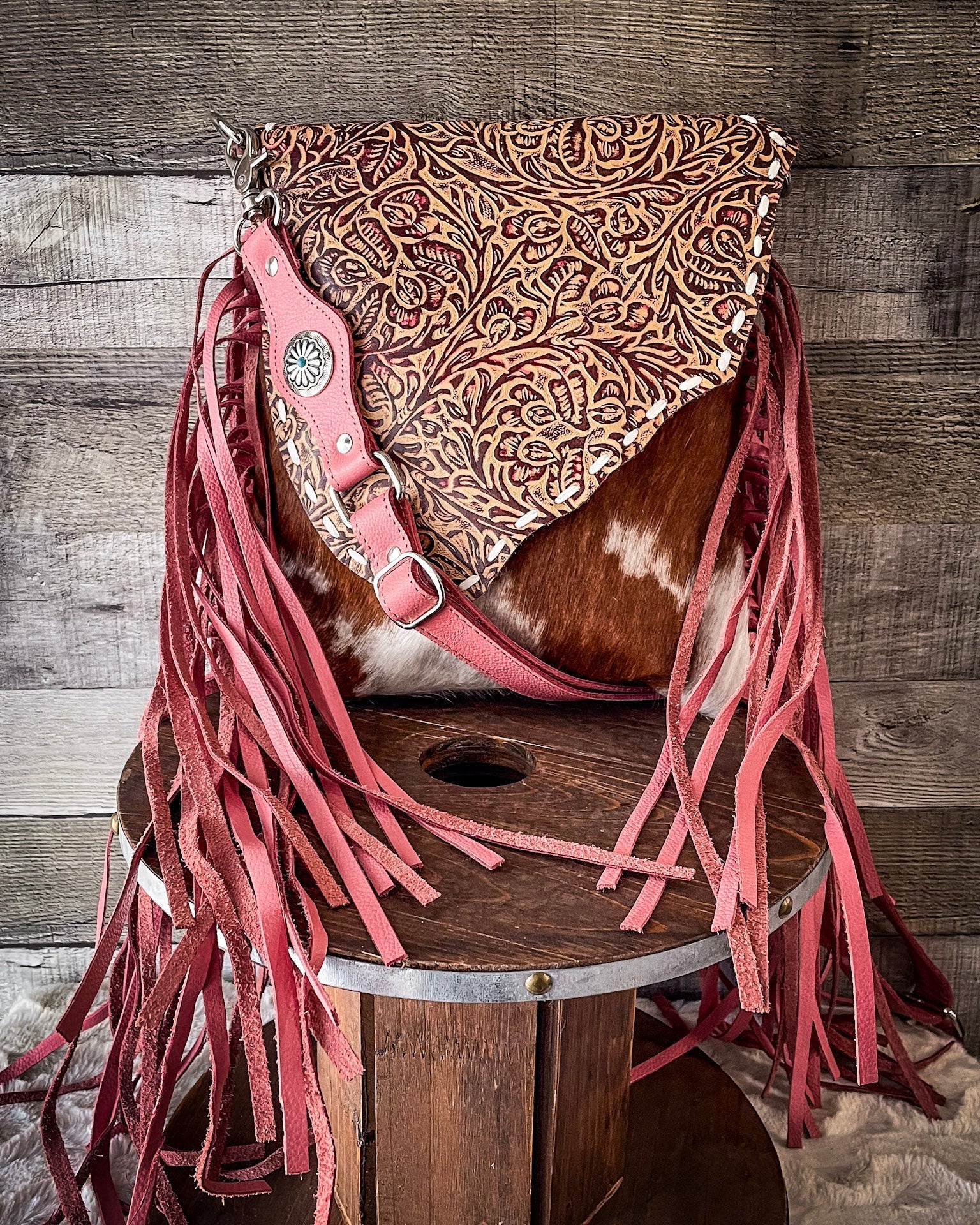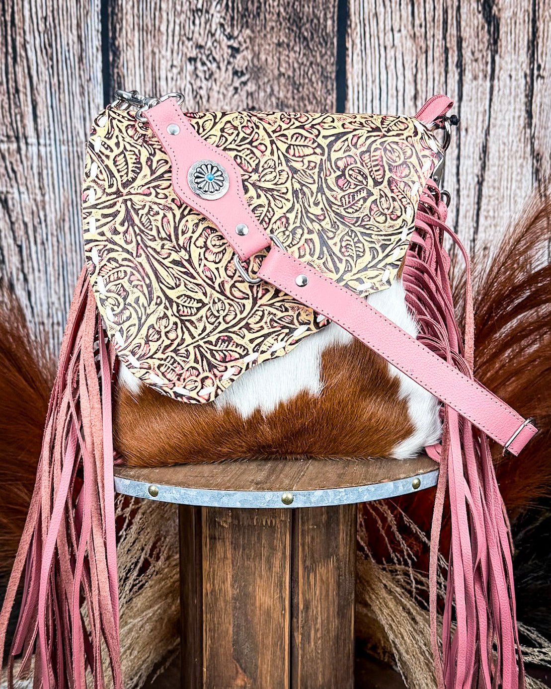 Crafted from genuine hair-on-hide, rich embossed leather, and accented with long salmon-colored fringe, this bag turns everyday carry into a full-on statement. The embossed leather flap features an intricate floral-and-vine pattern, flowing in curves that feel soft and strong all at once. Paired with the natural hide body—each one unique in its markings—you’re looking at a bag that’s just as individual as you are.
