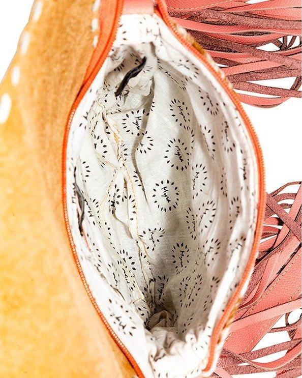 We can’t promise you’ll get the exact bag pictured, and that’s part of the magic. Whether your hide is speckled, streaked, or smooth, your bag will be completely one-of-a-kind. No two are ever the same, and that’s what makes it feel personal.The salmon-colored leather fringe running down both sides gives this bag a playful edge and a whole lot of movement. It’s soft, flowy, and adds just the right amount of flair—perfect for those who like their accessories with a side of sass.