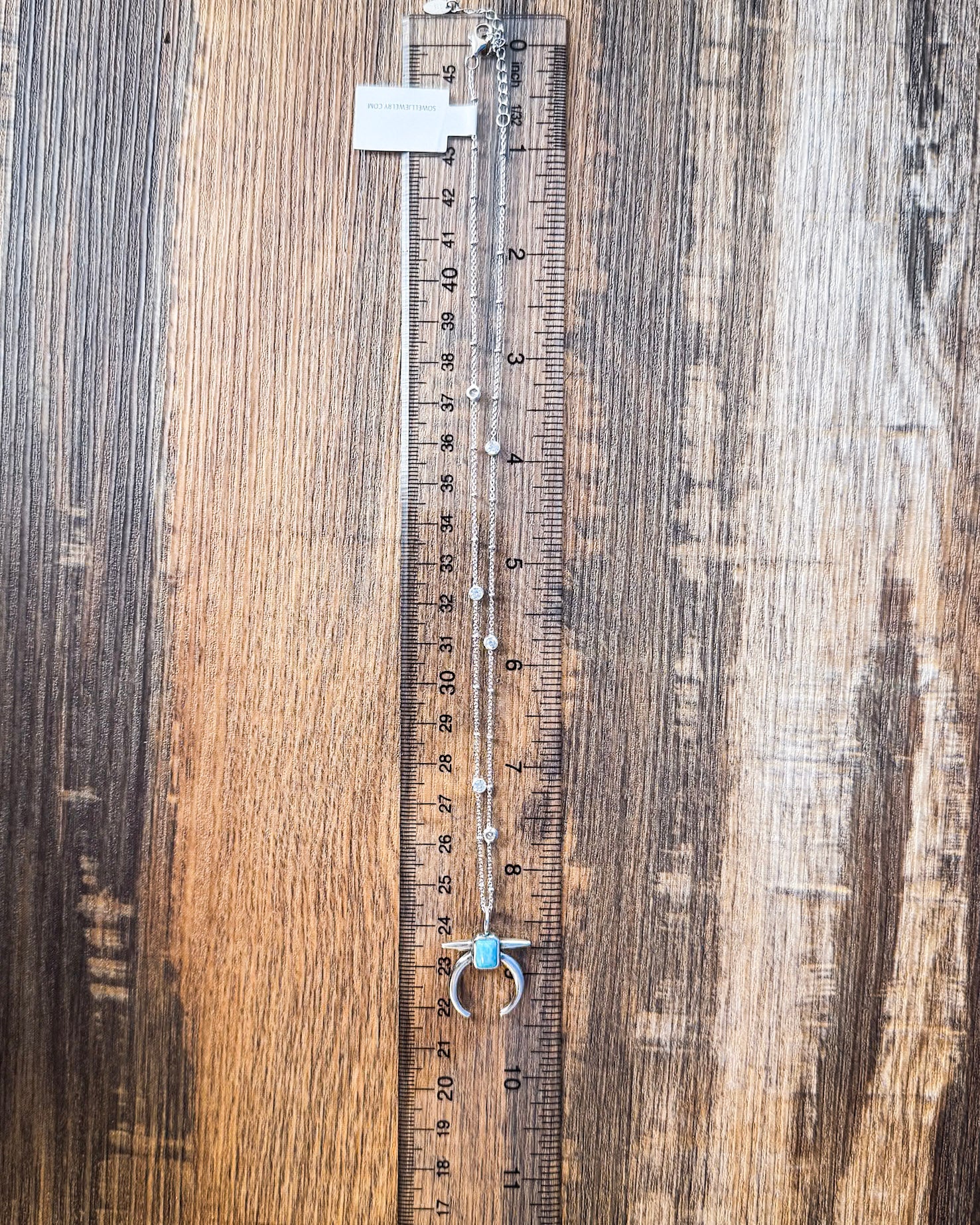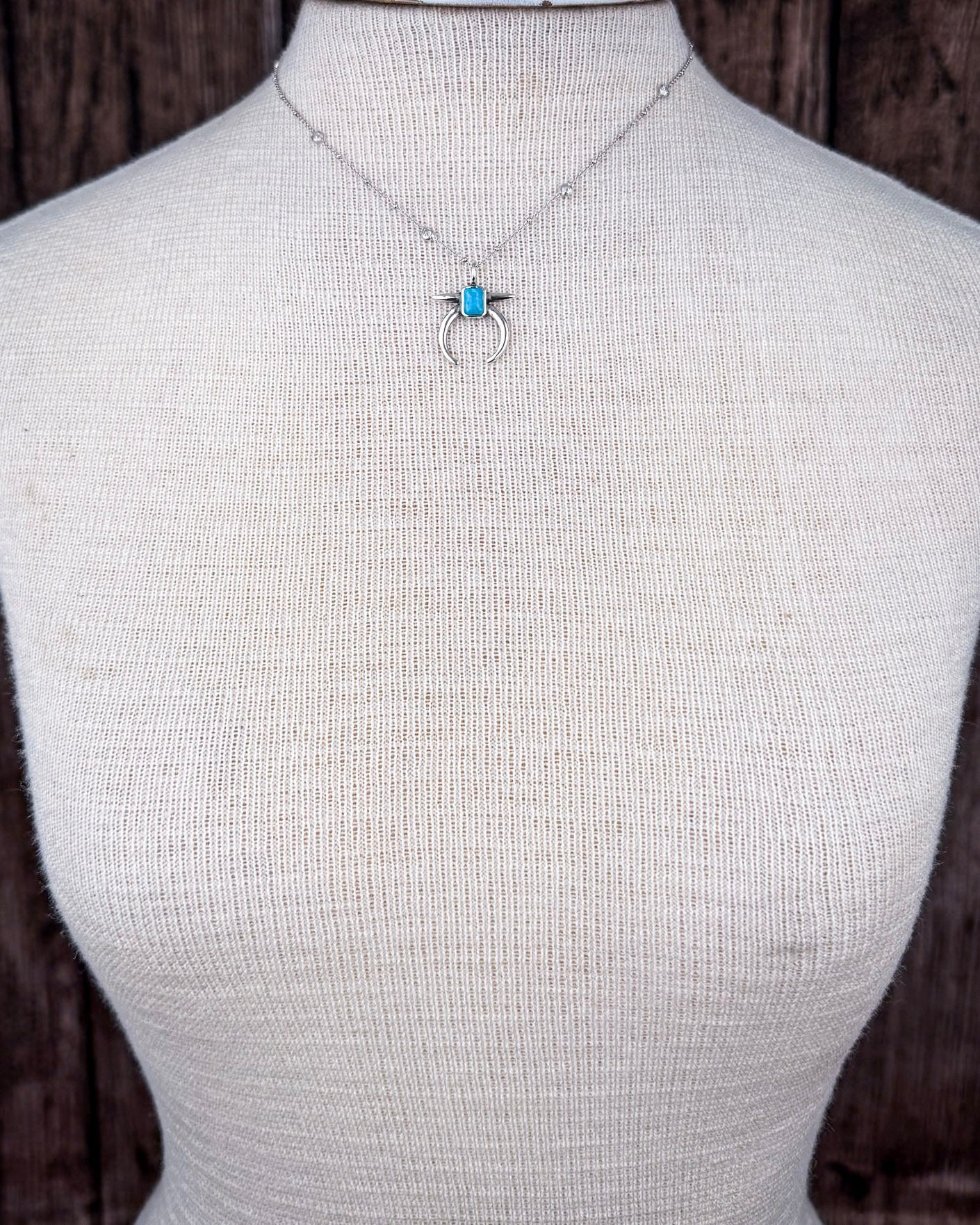 The pendant features a high-quality, handcrafted crescent shape in solid 925 sterling silver, set with a genuine turquoise stone right at the center. The turquoise is beautifully unique, with natural veining and variation that makes every necklace one of a kind. It brings that soft desert color pop—cool, earthy, and rich with character.